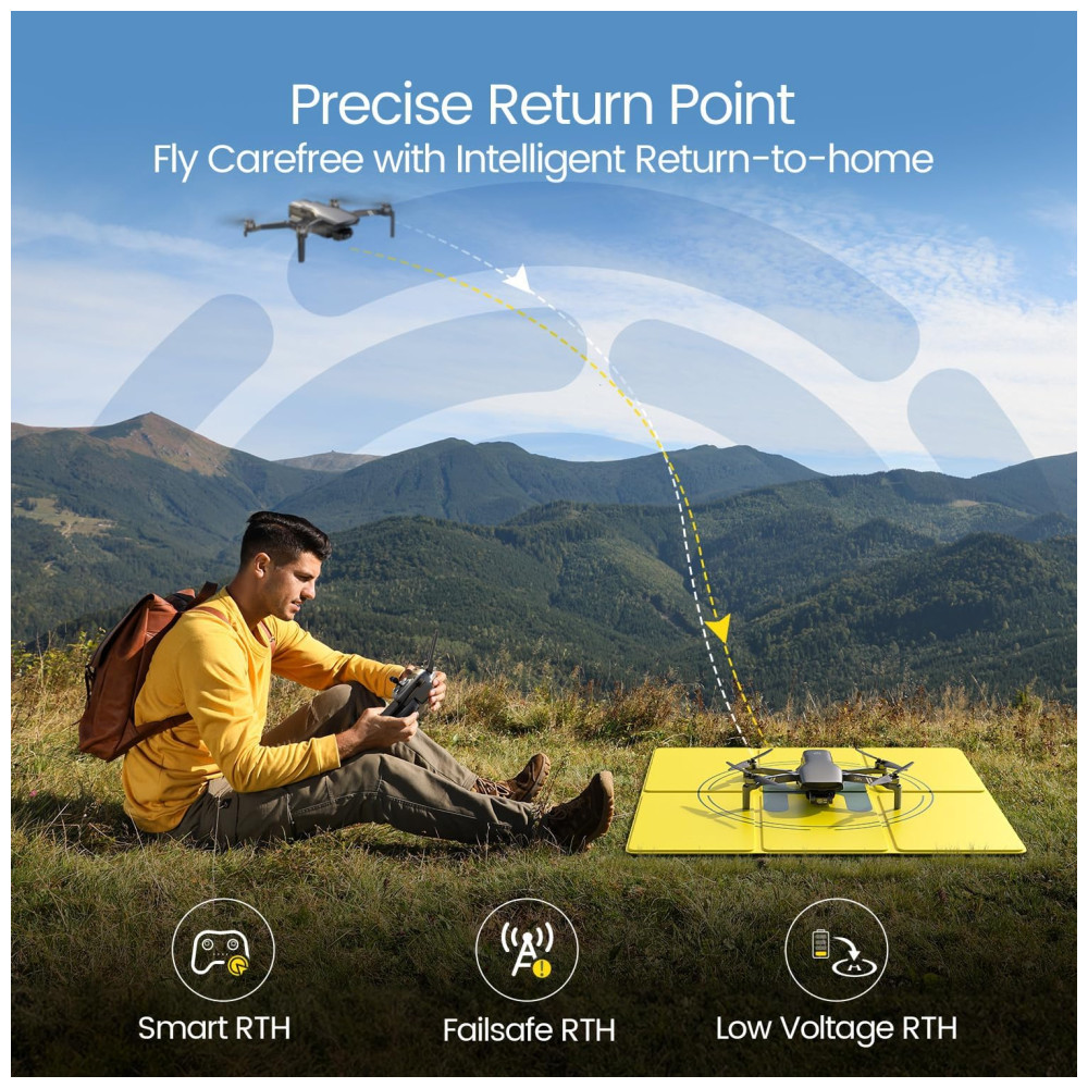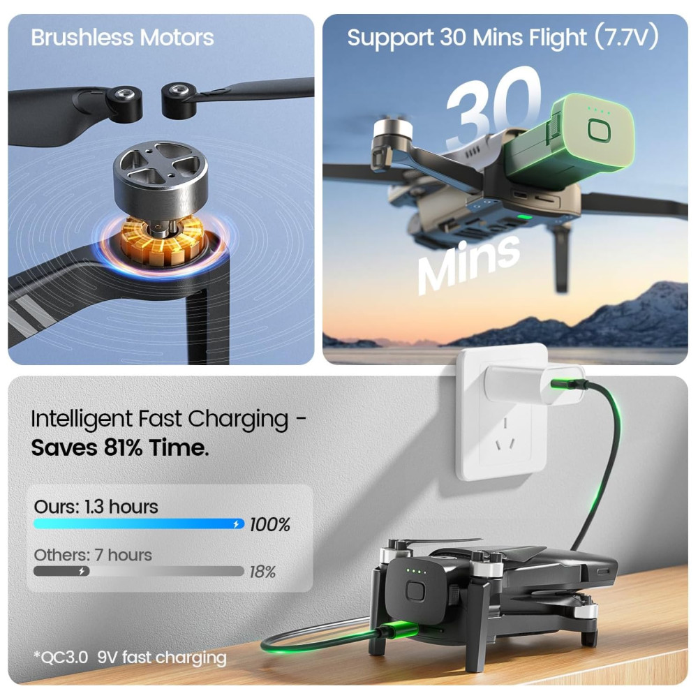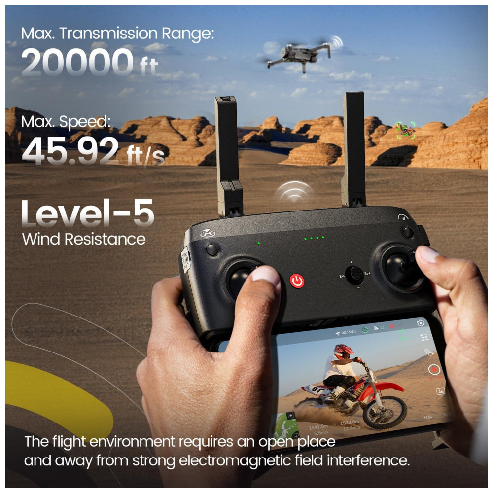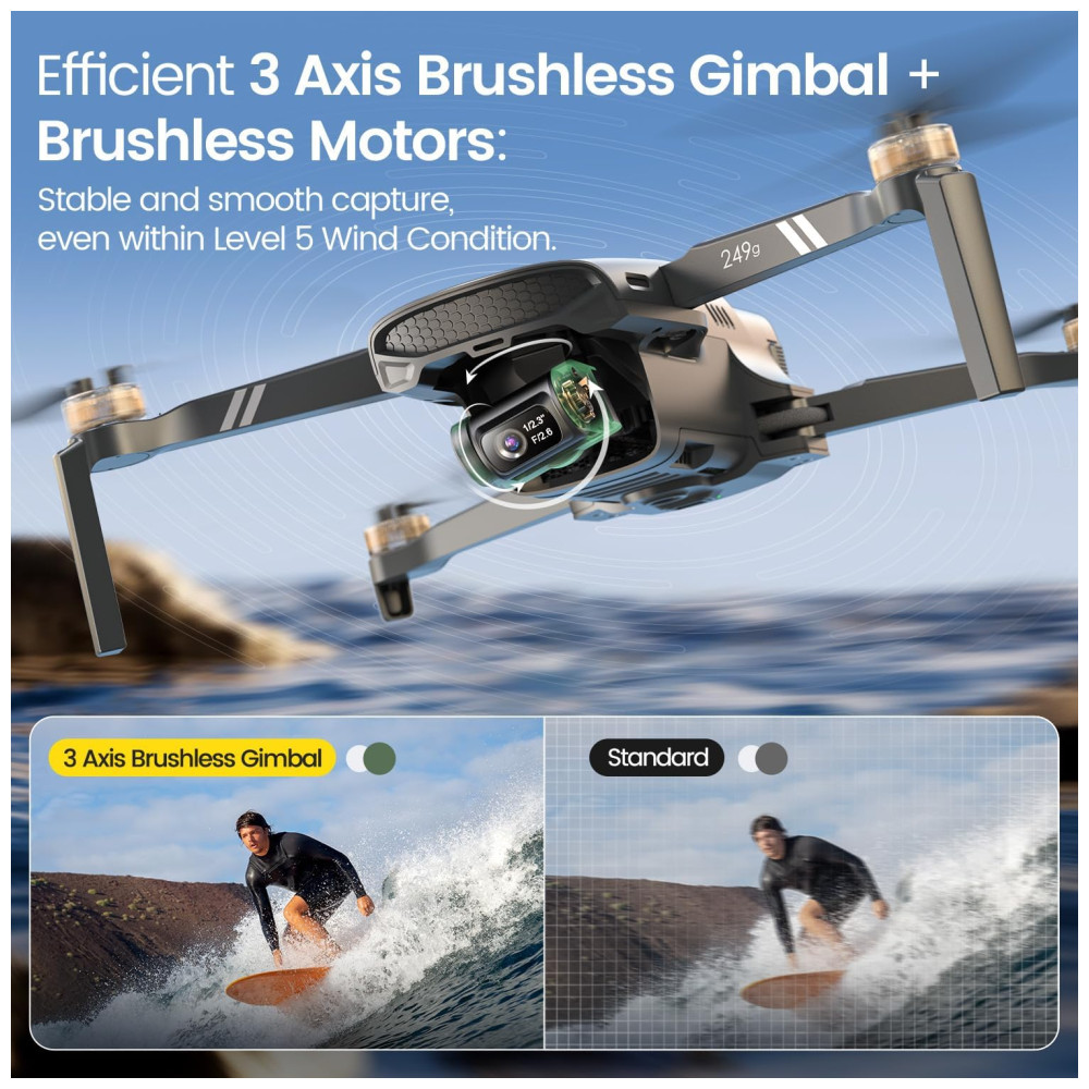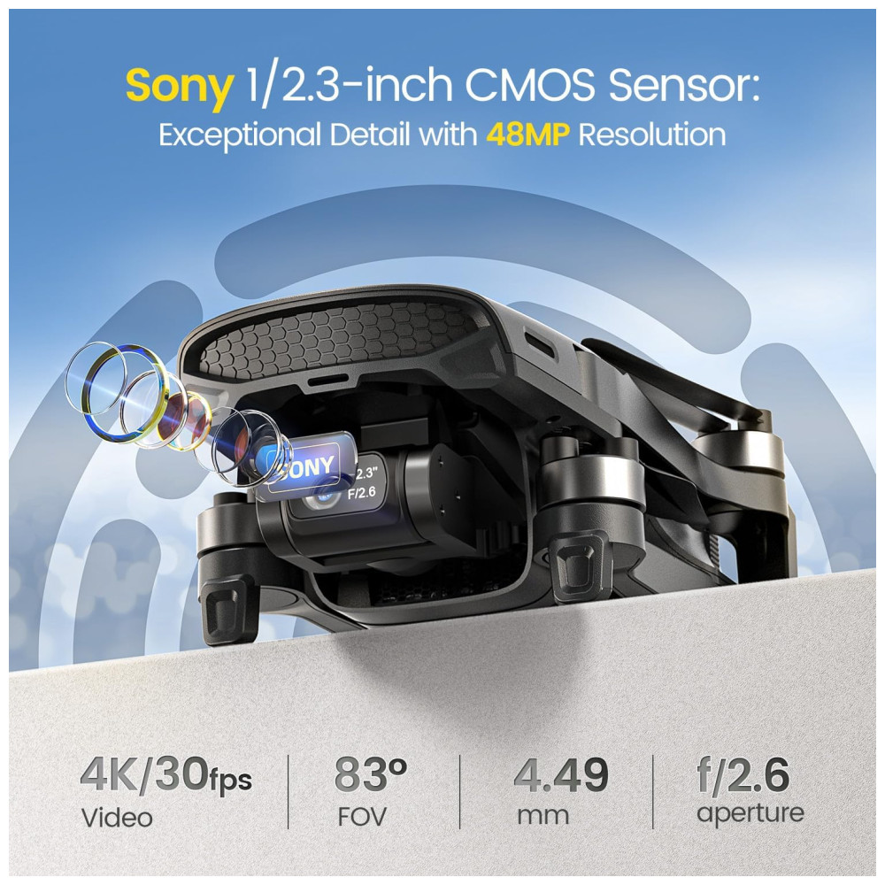 Sua câmera profissional 4K é equipada com um sensor CMOS SONY de 12,3 MP e uma abertura de f/2.6, permitindo tirar fotos com 48 MP e gravar vídeos em 4K a 30 FPS e 1080P a 60 FPS, capturando imagens com detalhes impressionantes. O gimbal sem escovas de 3 eixos proporciona filmagens suaves e estáveis, mesmo com ventos de até 38 km/h.