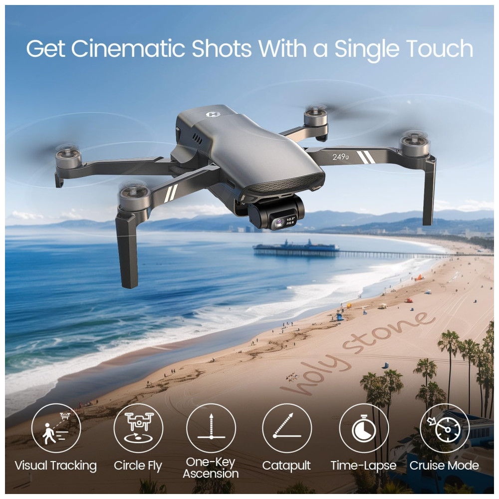 O sistema de controle avançado da Holy Stone torna as operações simples e acessíveis até para iniciantes. O aplicativo Holy Stone Sirius oferece modelos de filmagem intuitivos que ajudam a criar vídeos de nível profissional para compartilhar nas redes sociais.