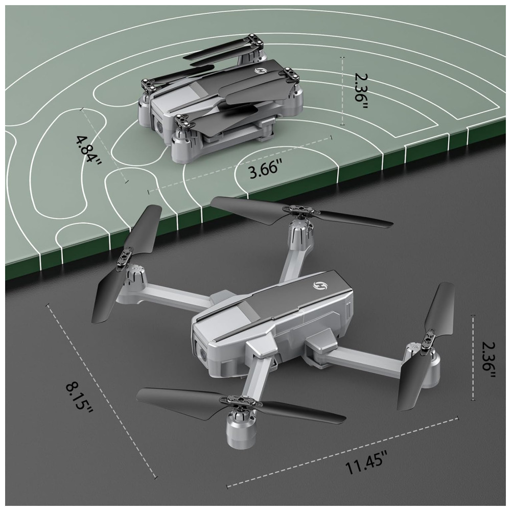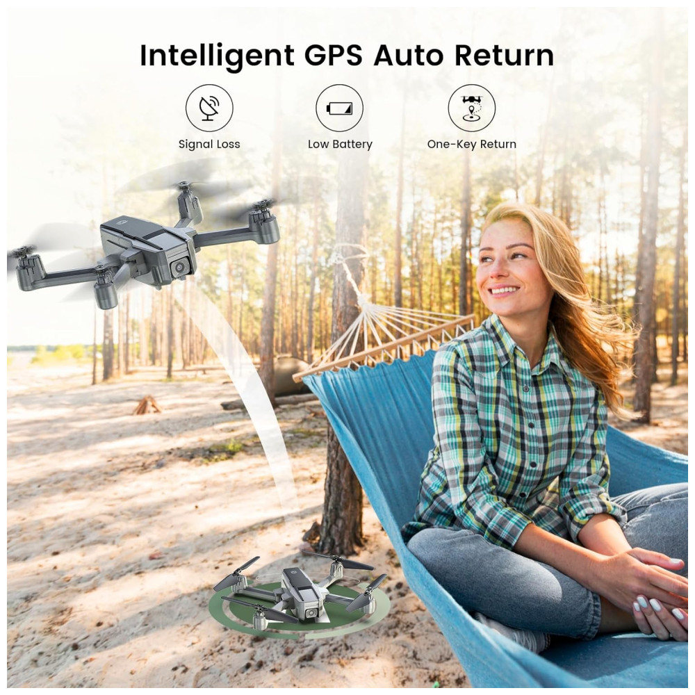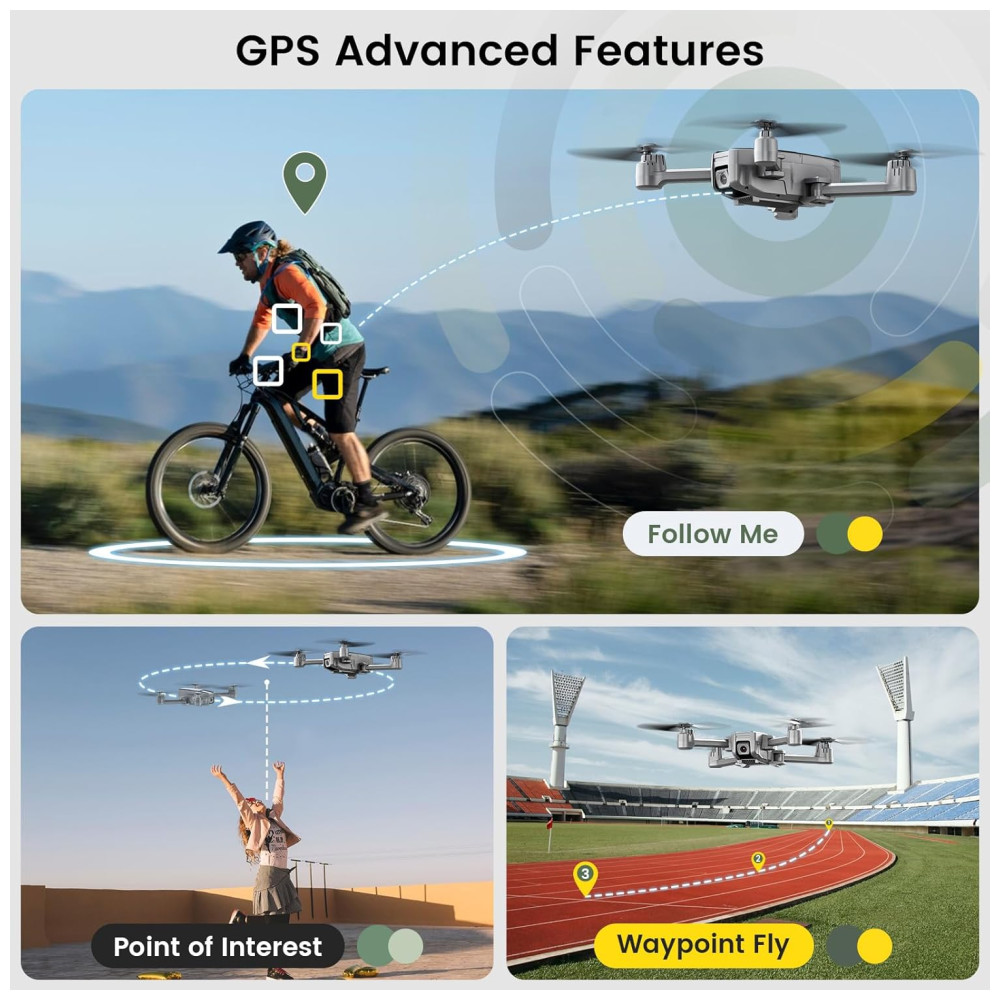 Esta câmera 4K Ultra Clear é equipada com uma lente de 120º de campo de visão (FOV) e uma lente ajustável de 90º, proporcionando imagens com resolução perfeita de 3840×2160. Com o modo de voo GPS, você desfruta de uma experiência de voo sem preocupações, incluindo recursos como retorno automático, Follow Me, Waypoint Fly e Point of Interest.
