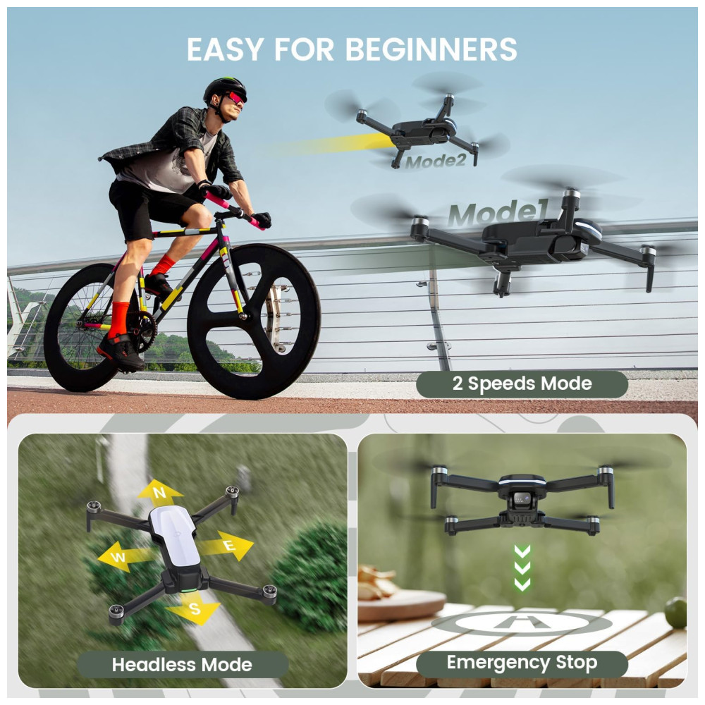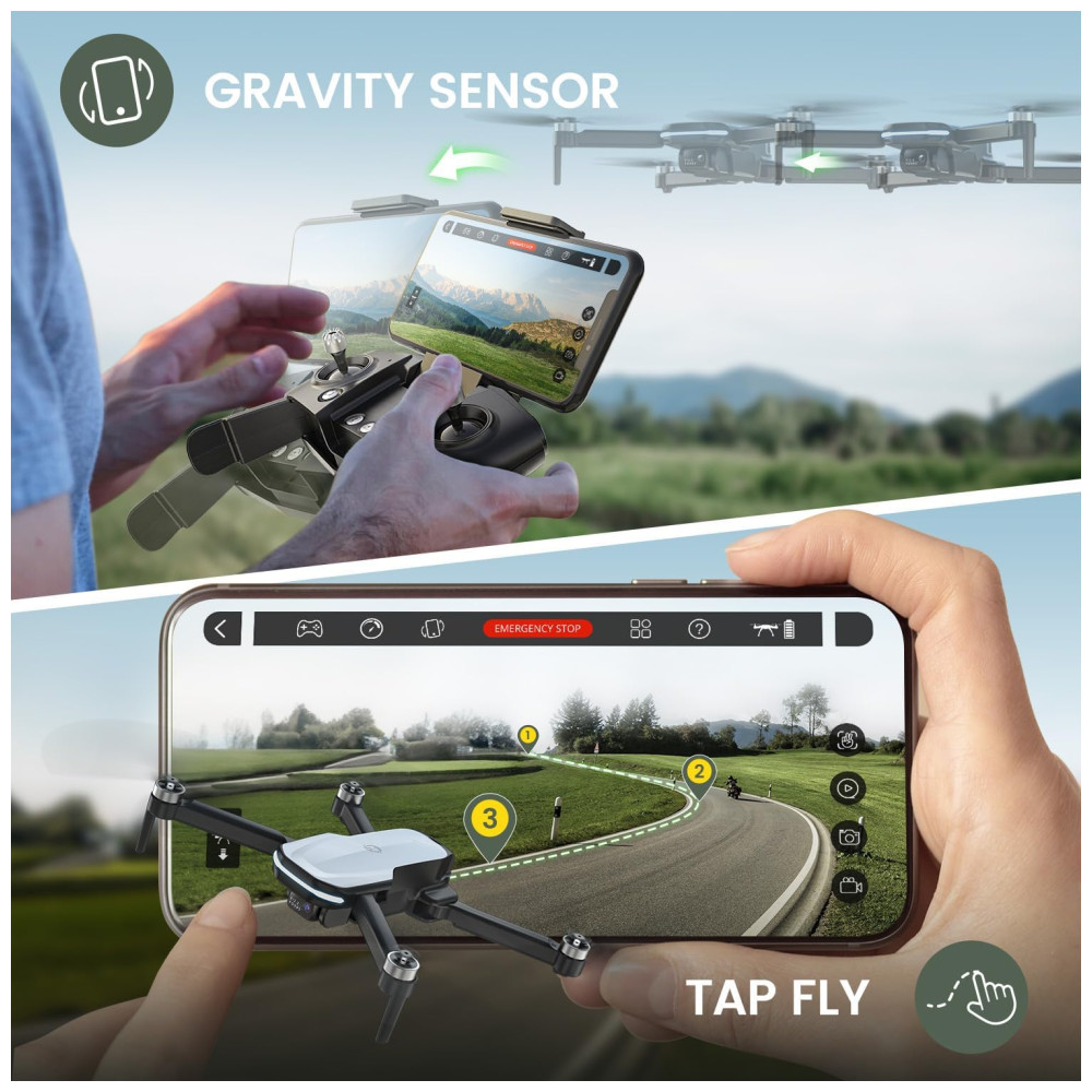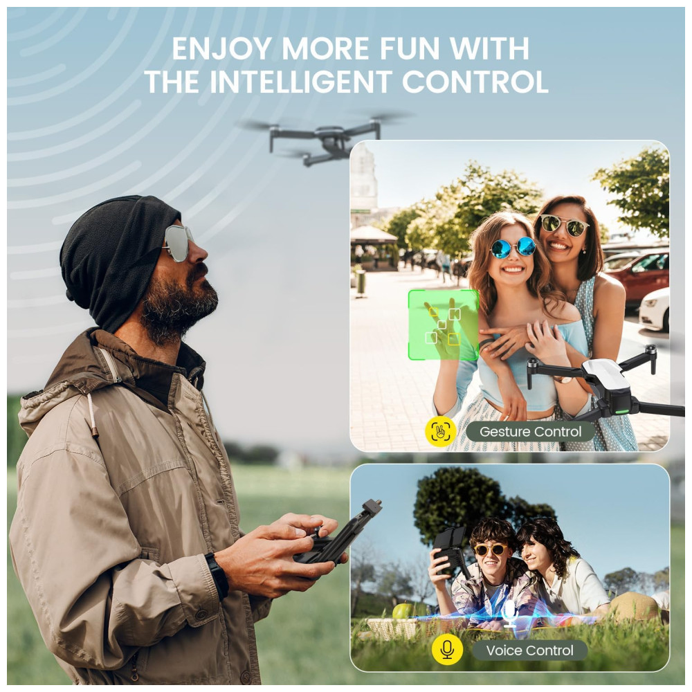 Este drone é super amigável para iniciantes, oferecendo funções práticas como decolagem e pouso com uma tecla, Tap Fly, retenção de altitude, modo sem cabeça (Headless Mode), dois modos de velocidade e funções de parada de emergência. Ele também conta com controle de gestos inteligente para tirar fotos e vídeos rapidamente—basta levantar a mão ou fazer um sinal de V.