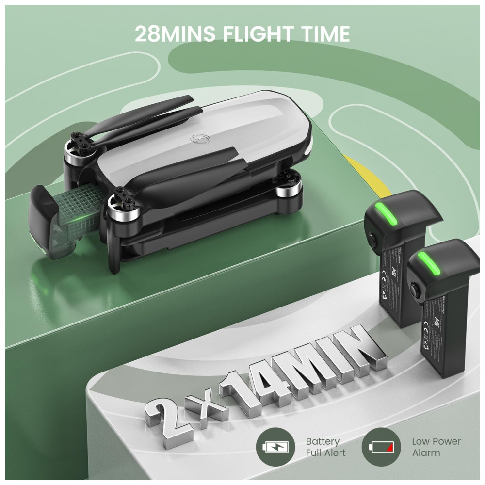 O HS280D vem com duas baterias recarregáveis, que garantem até 28 minutos de voo. As baterias modulares são fáceis de carregar e substituir, e o controle remoto avisa quando a bateria está fraca, garantindo que você nunca perca o drone.