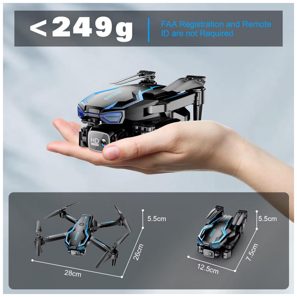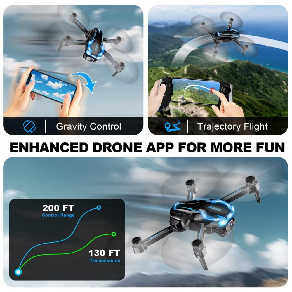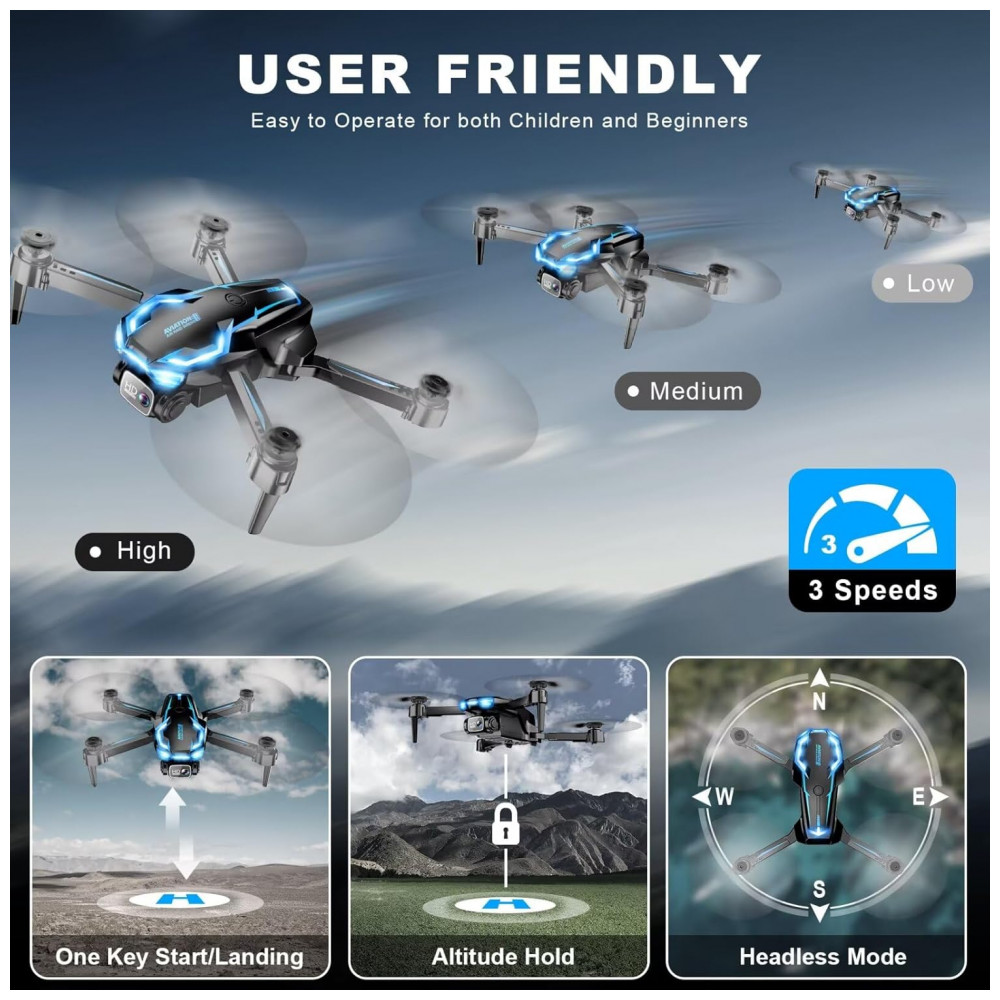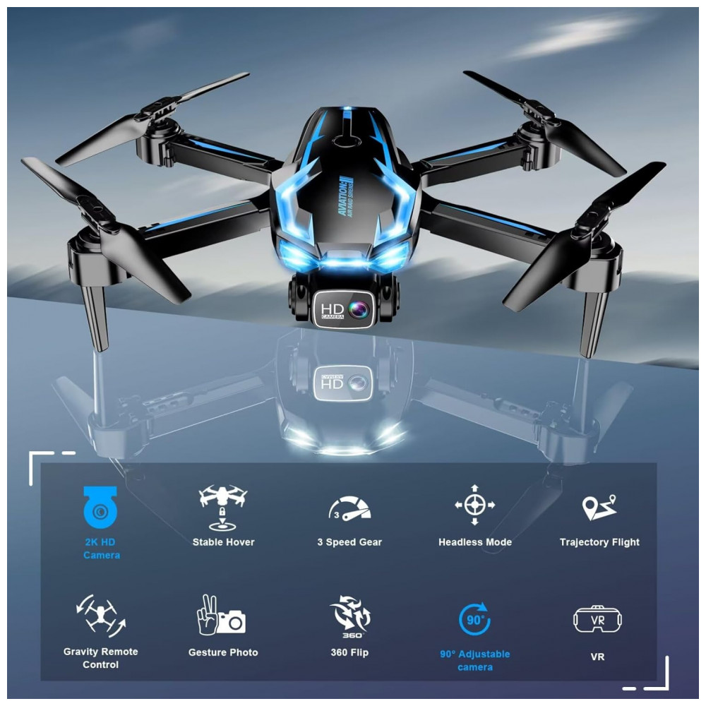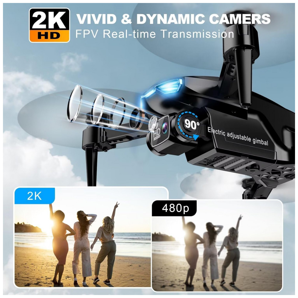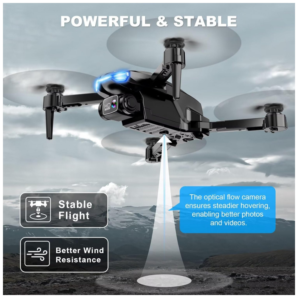 Capture imagens aéreas deslumbrantes com a câmera 2K HD ajustável em até 90 graus, perfeita para paisagens ou momentos em família. Desfrute da transmissão FPV em tempo real para o seu smartphone via WiFi e compartilhe suas aventuras nas redes sociais com apenas um toque! Decolagem e pouso fáceis com controle de um toque, enquanto o Modo Altitude Hold garante uma filmagem estável. Controles de voo inteligentes e estáveis, com Posicionamento Óptico de Fluxo aprimorado e Modo Headless para uma pilotagem intuitiva – basta inclinar o controle para voar em qualquer direção! Leve e dobrável, pesando menos de 2 kg e dobrando para apenas 12,7 x 7,6 x 5,1 centímetros, este mini drone cabe no seu bolso ou mochila. Leve para onde quiser – seja para caminhadas, viagens ou explorações – e nunca perca uma foto aérea épica! Inclui 2 baterias recarregáveis, totalizando 20 minutos de voo. Alertas de baixa voltagem e proteção contra sobrecarga garantem a segurança. Protetores de hélice e lâminas sobressalentes evitam danos, enquanto o controle remoto ergonômico garante precisão para iniciantes e especialistas.