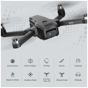 O drone K600 com câmera é equipado com motores sem escova mais eficientes e duradouros, além de uma função de ajuste motorizado de 90°, permitindo controlar o ângulo da lente diretamente pelo controle remoto. O sistema de posicionamento de fluxo óptico e a IMU garantem informações precisas para um voo estável, semelhante a um drone GPS.