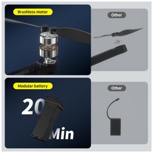 Com baterias modulares de íons de lítio leves e de fácil substituição, o drone suporta voos prolongados, permitindo estender o tempo de voo. Ele também conta com recursos simplificados, como auto hover, decolagem e pouso com um único botão, tornando-o fácil de manobrar, mesmo para iniciantes.