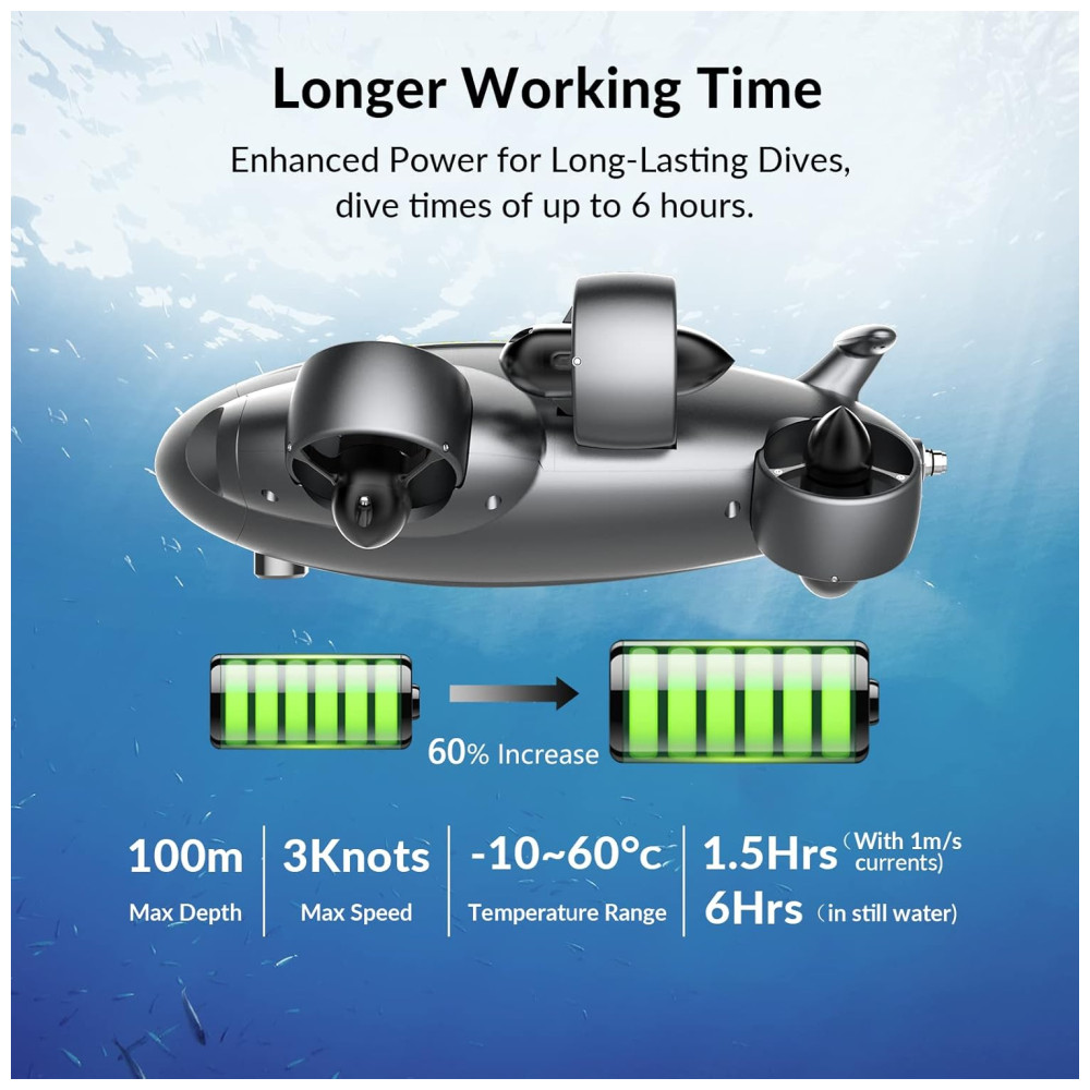 Estenda e melhore seus mergulhos Drone subaquático FIFISH V6 EXPERT equipado com bateria de 14400mAh, tempo de trabalho de até 6 horas. E forneça recursos de carregamento rápido para atingir 90 da capacidade de carregamento em apenas 1 hora. Integre se ao sistema de fornecimento de energia onshore para obter sessões de mergulho ininterruptas.