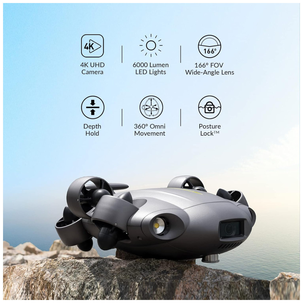Drone Subaquático Inteligente com Câmera 4K UHD Braço Robótico até 6 Horas de Ação QYSEA FIFISH V6 Preto