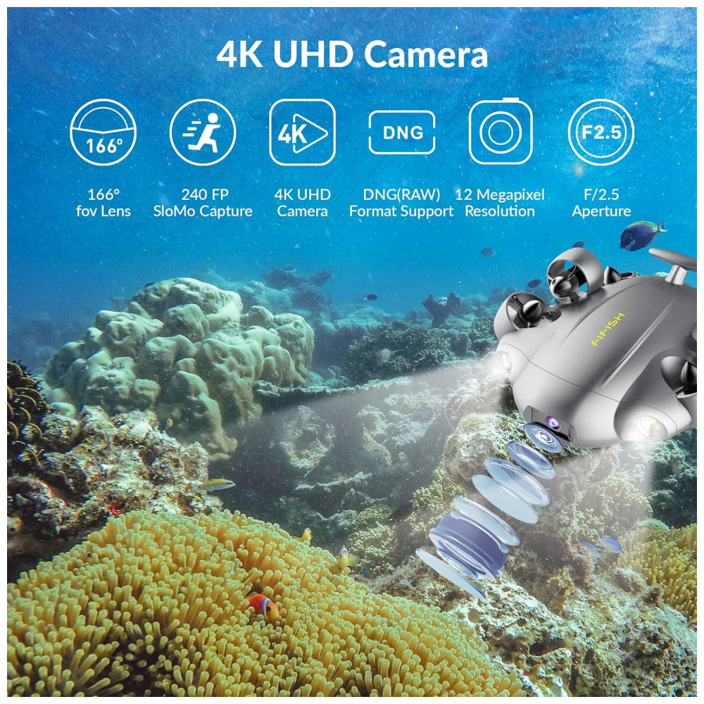 Clareza 4K com iluminação aprimorada o sistema de câmera do drone subaquático FIFISH V6 EXPERT oferece aos usuários gravação 4K com baixo ruído, um campo de visão ultra amplo de 166 , filmagem em câmera lenta de 240 FPS e algoritmos de aprimoramento de cores. Um par atualizado de luzes LED de 6000 lúmens oferece visuais altamente vívidos e vibrantes, mesmo em espaços turvos e escuros