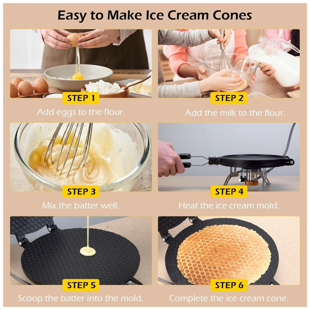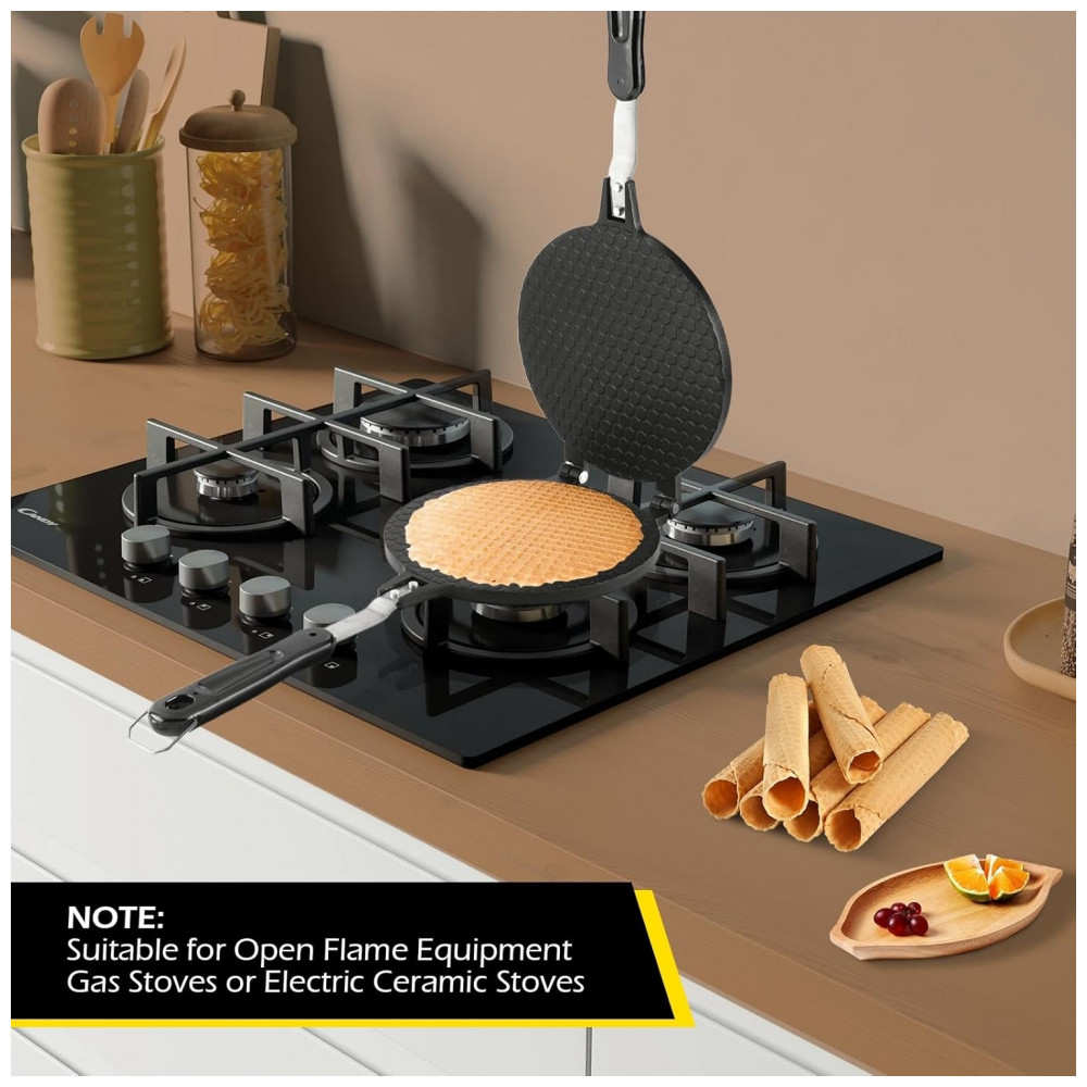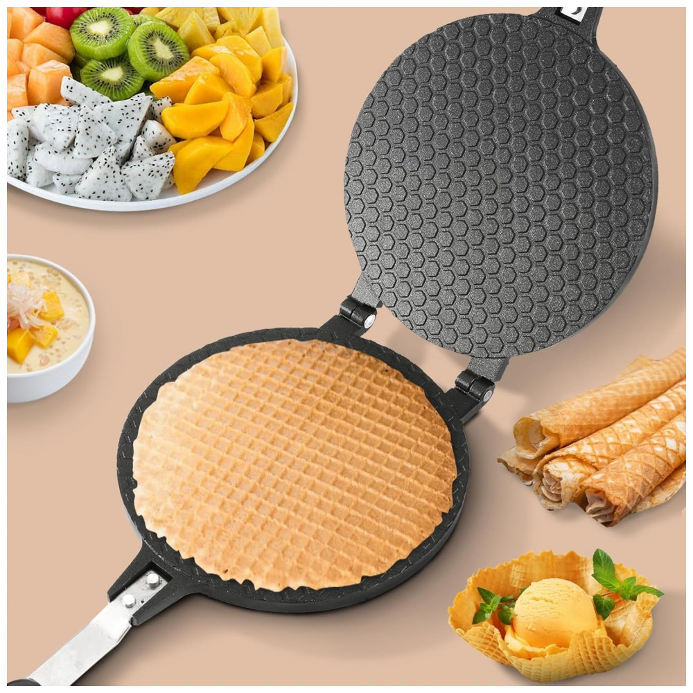 A Máquina para Waffle Cone Dyna-Living oferece alto desempenho com rápido aquecimento e geração uniforme de calor, suportando temperaturas de até 450°C, garantindo robustez e durabilidade. Seu design inclui um cabo longo que proporciona fácil manuseio, é antiderrapante e possui excelente dissipação térmica e isolamento, permitindo abrir e fechar com facilidade. Fabricada em liga de alumínio de alta qualidade, a superfície é segura para alimentos, não tóxica e antiaderente, facilitando a limpeza e assegurando a saúde para preparar cones de sorvete. Com esta máquina dupla-face, basta pressionar as duas placas para criar cones e tigelas de waffle em poucos minutos, possibilitando a produção de diversas formas e sobremesas caseiras. Ideal para café da manhã ou lanches à tarde, você pode preparar pizzas, panquecas, omeletes, cones de sorvete, tigelas de waffle, rolinhos de ovo e waffles em formato de ovo. Compatível com fogões a gás residenciais (não indicada para fogões de indução), é perfeita para uso doméstico, barracas de comida e restaurantes, além de ser uma excelente ferramenta para iniciar um negócio gastronômico.