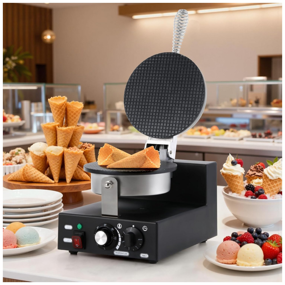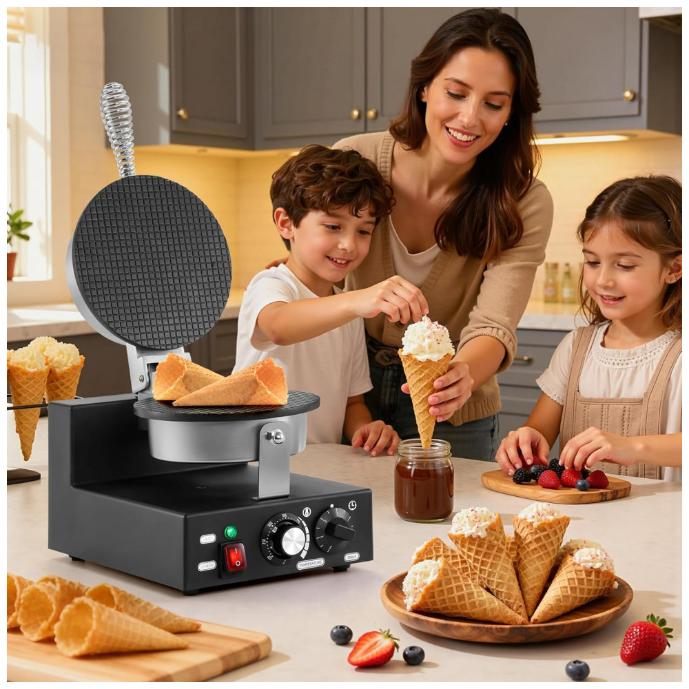 A Máquina de Waffle Cone Comercial Dyna-Living oferece desempenho excepcional para criar cones de sorvete crocantes e deliciosos, ideal para uso em restaurantes, festas ou em casa. Fabricada com plástico ABS de qualidade alimentar, resistente à umidade e ao desgaste, esta máquina possui potência de 1200W com aquecimento eficiente e uniforme em ambos os lados, garantindo waffles perfeitamente cozidos e crocantes. Seu controle independente de temperatura varia de 50°C a 300°C, aliado a um timer ajustável de 1 a 5 minutos, permite um preparo preciso, garantindo sempre o cone ideal. As placas de aquecimento são revestidas com Teflon antiaderente, facilitando o desprendimento dos cones e a limpeza rápida apenas com um pano úmido ou seco, tornando a máquina prática e funcional para qualquer cozinha ou estabelecimento. O kit completo inclui a máquina preta, pegador de alimentos, batedor, rolo para cones, espátula, pincel para óleo, esponjas para limpeza e manual de instruções (as cores dos acessórios podem variar). Versátil, pode ser usada para fazer diferentes tipos de cones e rolos de sorvete, garantindo momentos saborosos e divertidos para toda a família e clientes.