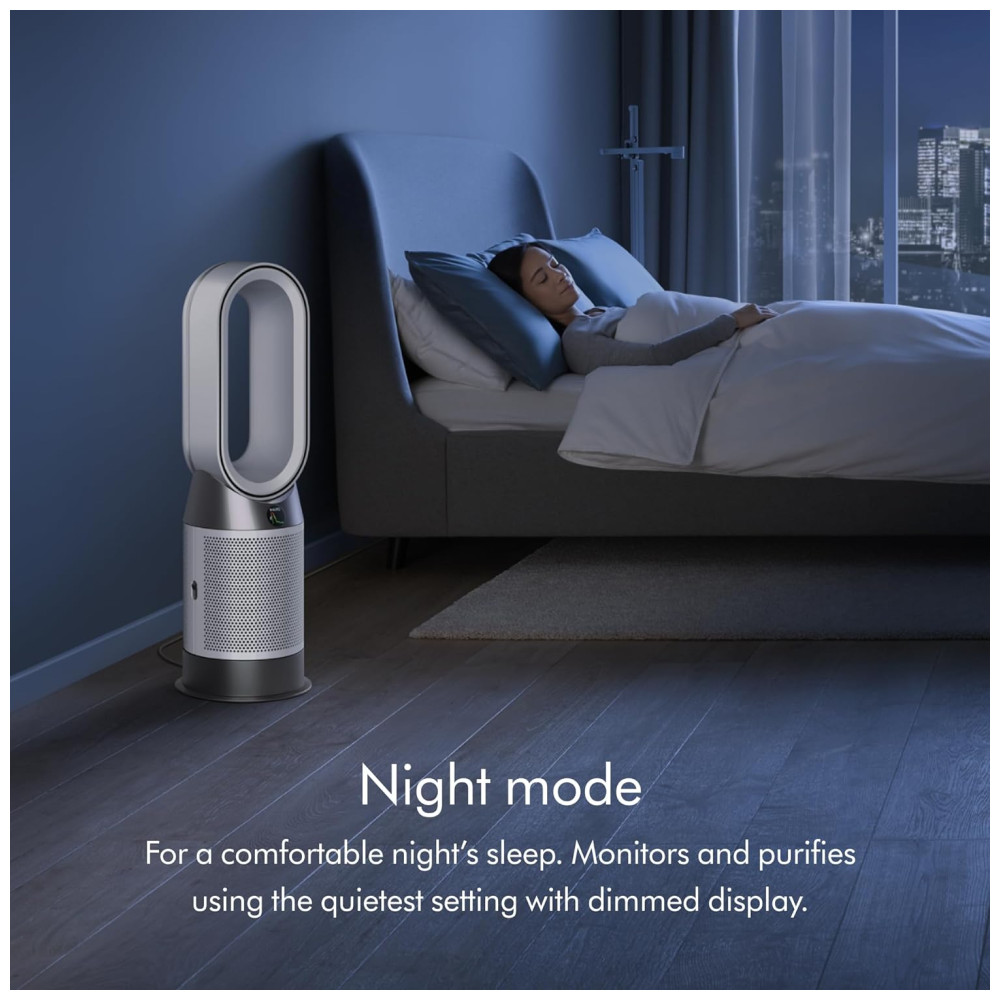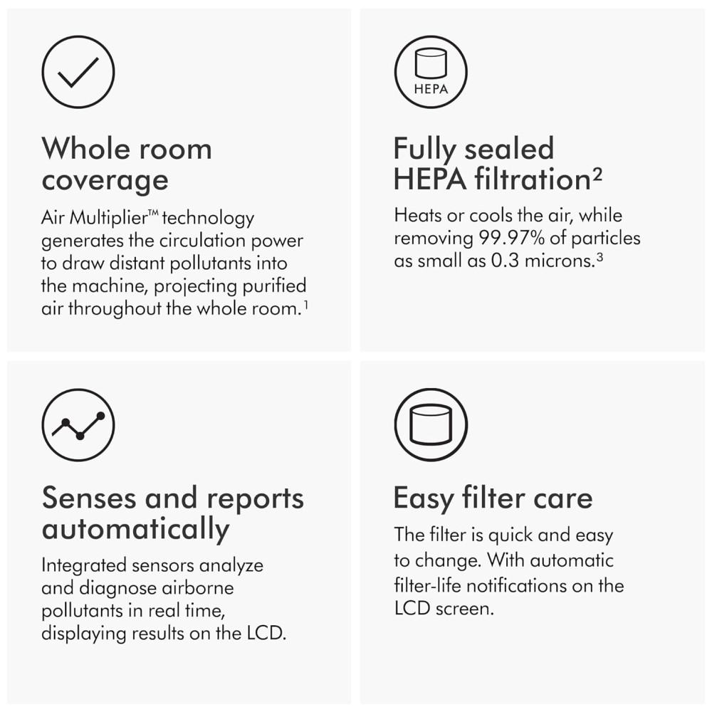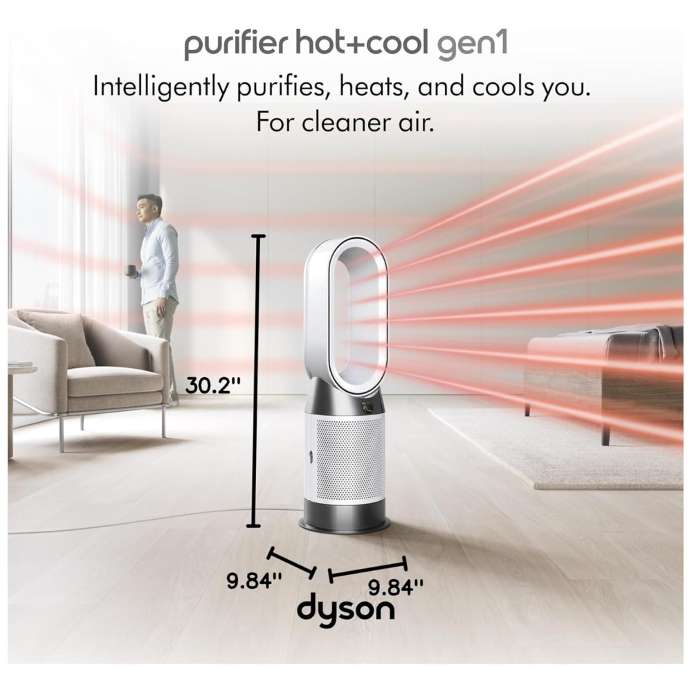 O Dyson Purifier HotCool Gen1 é um ventilador purificador que automaticamente detecta, captura e retém poluentes para purificar todo o ambiente. Ele aquece ou resfria o ar, enquanto remove 99,97% das partículas tão pequenas quanto 0,3 mícrons. Testado de acordo com os padrões internos da Dyson para projeção de ar em todo o ambiente DTM108 e cobertura de purificação TM003711. Desafio de partículas com óleo DEHS especificado em EN1822 dentro de uma câmara especificada em ASTM F3150. Testado no Modo Máx para eficiência de todo o aparelho acima de 99,95%. Taxas de captura de gases variam. Testado de acordo com ISO 29463. A tecnologia Air Multiplier circula o ar purificado por todo o ambiente. Purificador para o ano inteiro. Aquece no inverno, refresca no verão. Controle remoto curvo e magnetizado se armazena de forma organizada na máquina. Não compatível com aplicativos. Oscila até 350°. Programado para desligar após intervalos pré-definidos de 1, 2, 4 e 8 horas. Totalmente selado no padrão HEPA. Então o que entra, fica dentro. Modo Noturno monitora e purifica utilizando as configurações mais silenciosas, com display discreto.