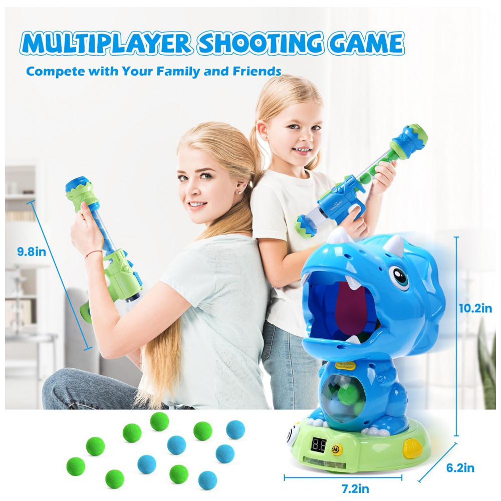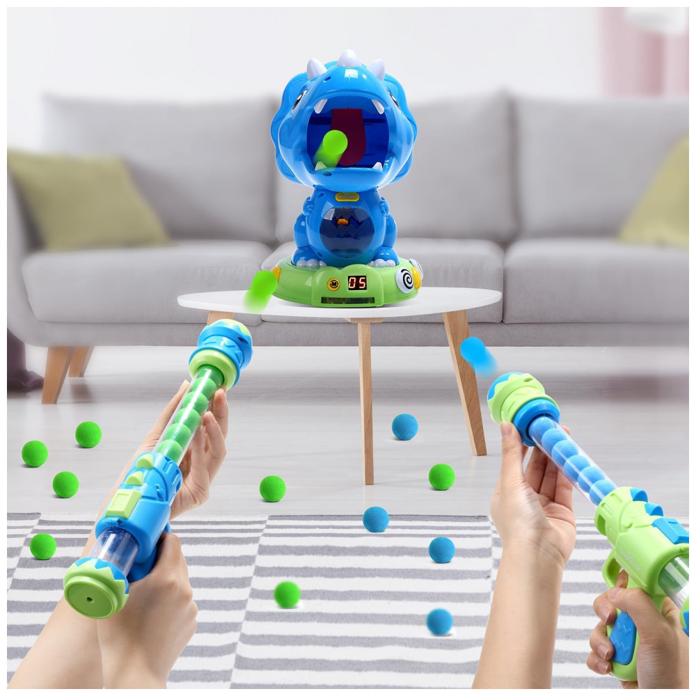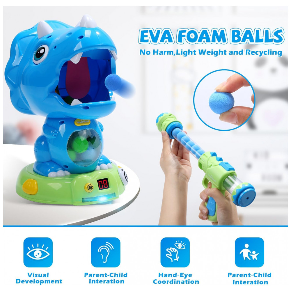 O kit versátil inclui 48 bolinhas de espuma EVA e 2 pistolas de ar com sistema de bomba aprimorado, oferecendo uma variedade de jogos de tiro repletos de desafios e diversão sem fim. A segurança é prioridade: as pistolas são feitas de ABS ecológico, enquanto as bolinhas de espuma EVA são leves, inofensivas e recolhidas facilmente na barriga do dinossauro, facilitando a reciclagem e evitando qualquer dano.