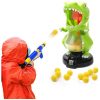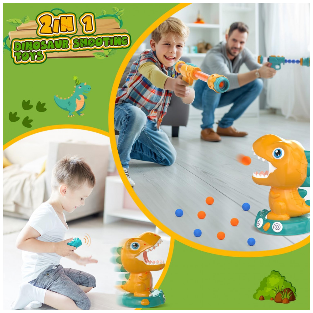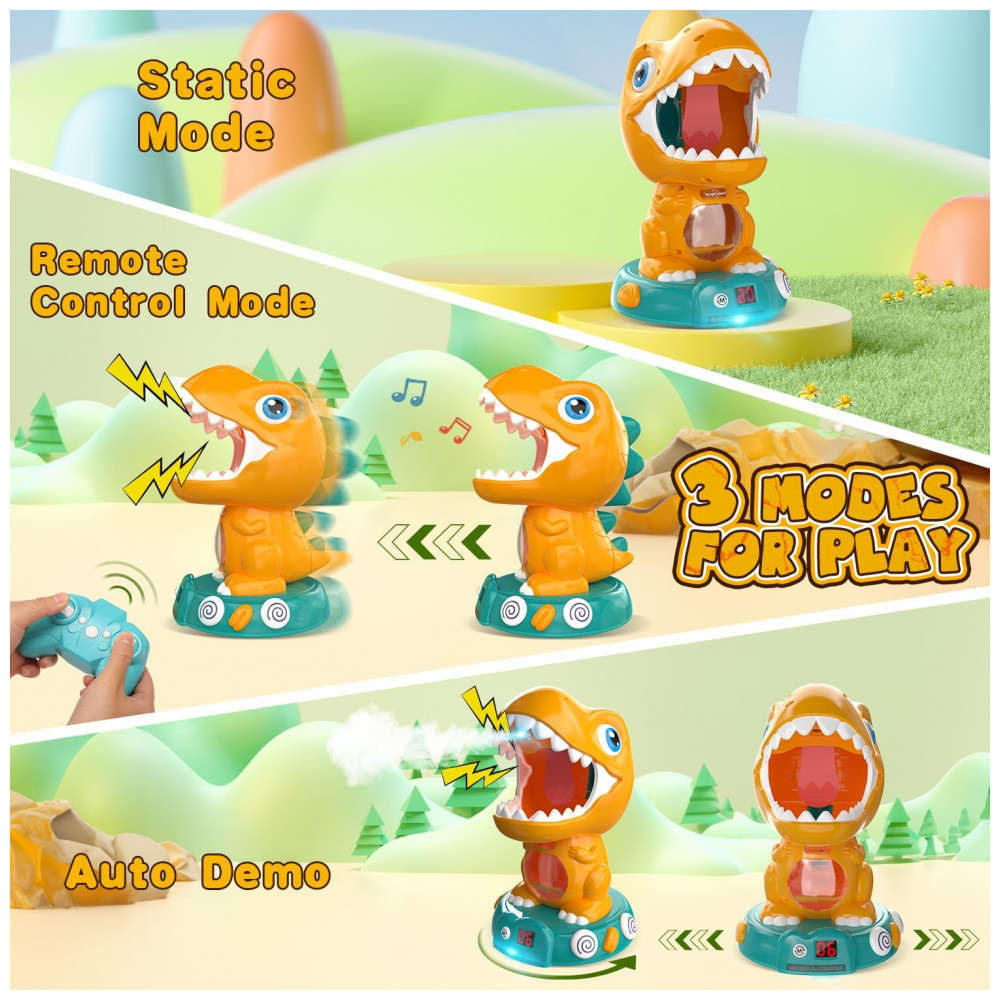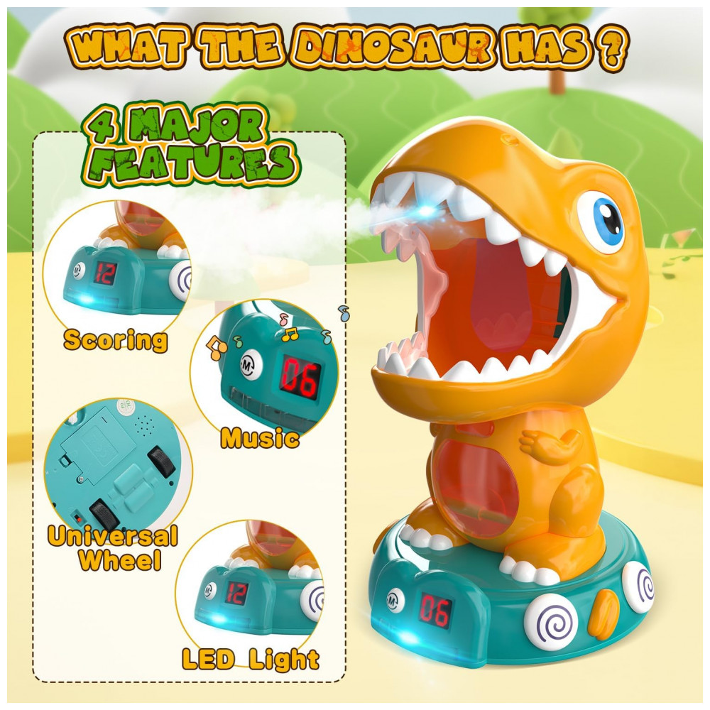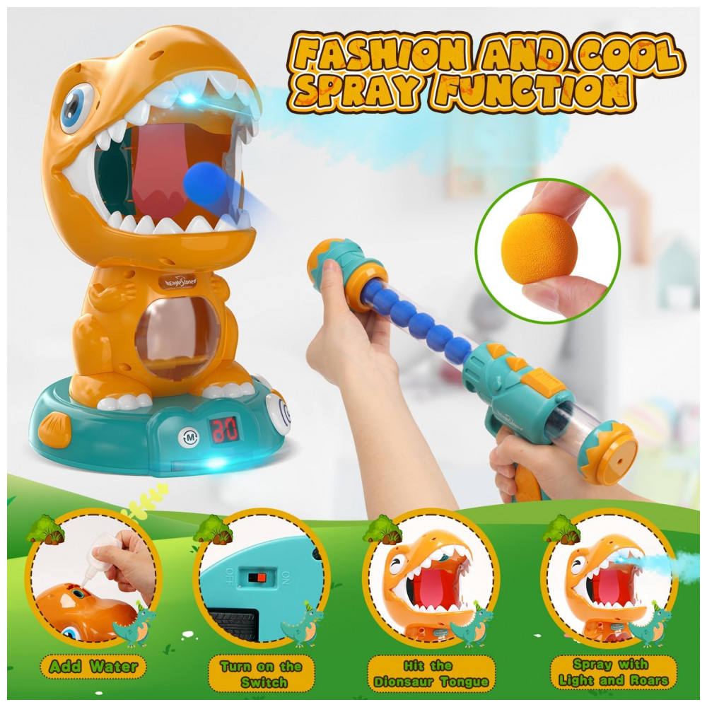 Este dinossauro vem equipado com um placar eletrônico em LED que registra automaticamente os acertos, emitindo sons de celebração a cada 5 pontos, aumentando a emoção durante o jogo. Além disso, possui uma função de névoa a vapor: ao adicionar algumas gotas de água no reservatório superior, o brinquedo solta fumaça e luzes ao receber um disparo na boca, proporcionando uma experiência ainda mais realista, como se estivesse no mundo dos dinossauros.