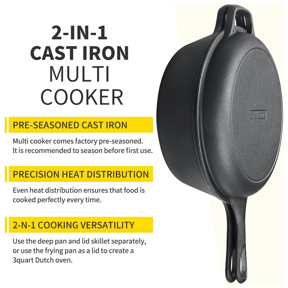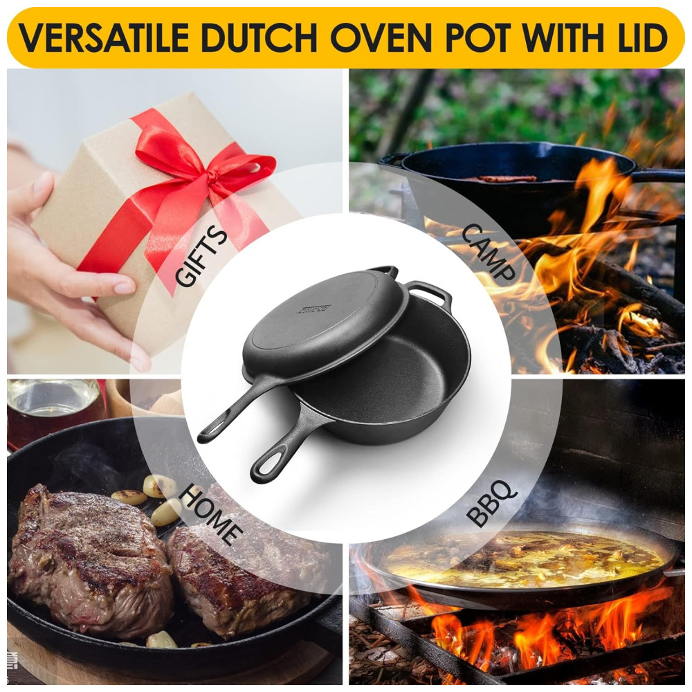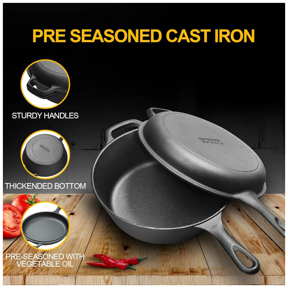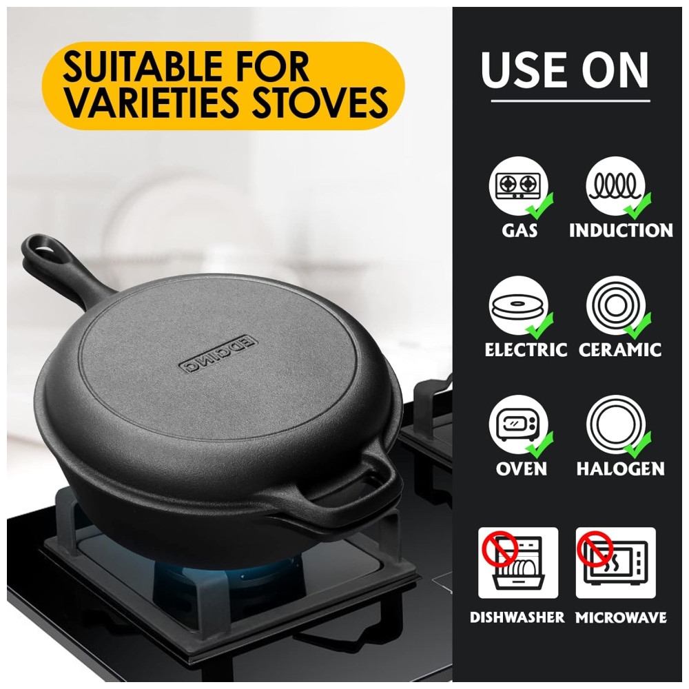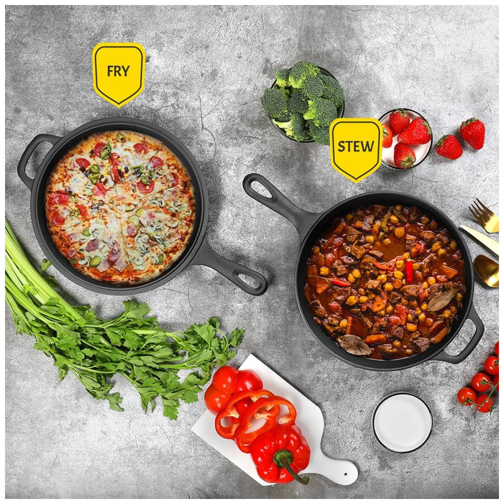 Conjunto de frigideira multifogão O conjunto de frigideira de forno holandês de ferro fundido inclui 2 unidades de frigideira de forno holandês de ferro fundido medindo 10 polegadas de diâmetro e capacidade de 4,4 litros. A frigideira pode ser usada como tampa para frigideira funda.