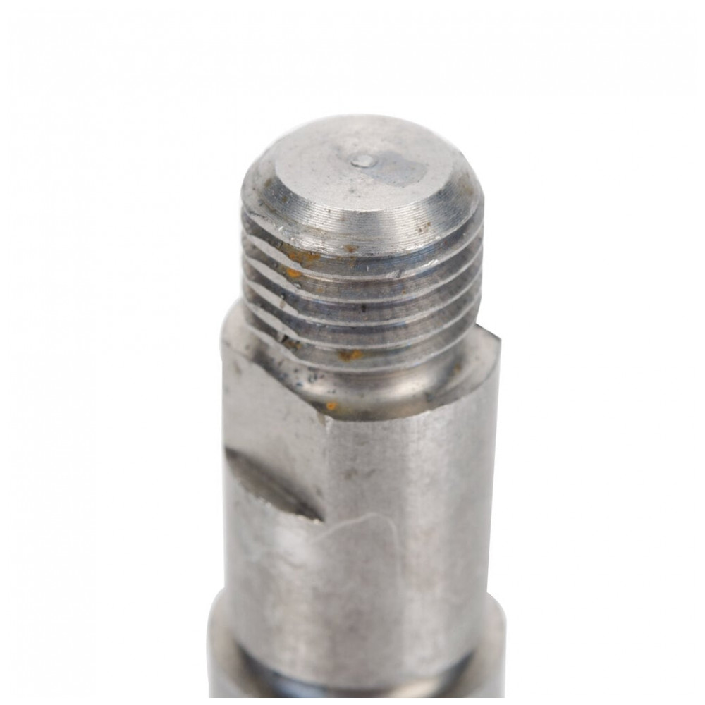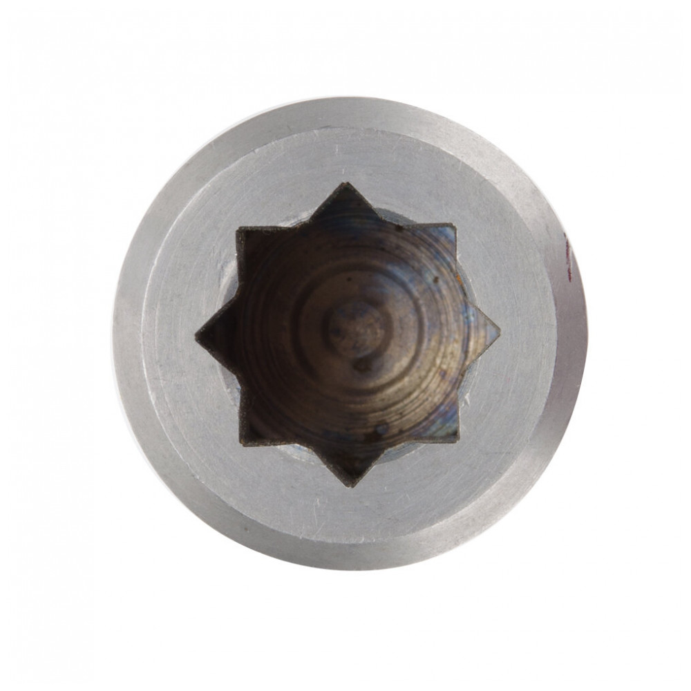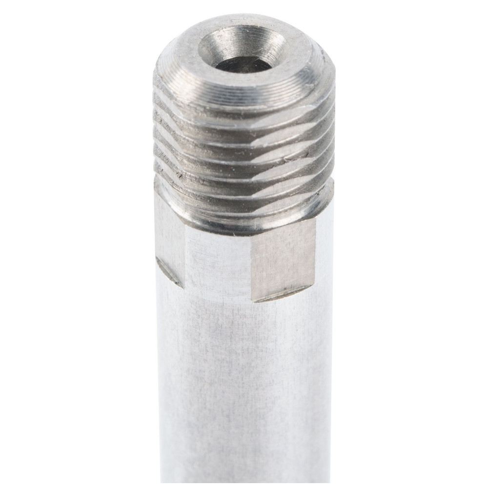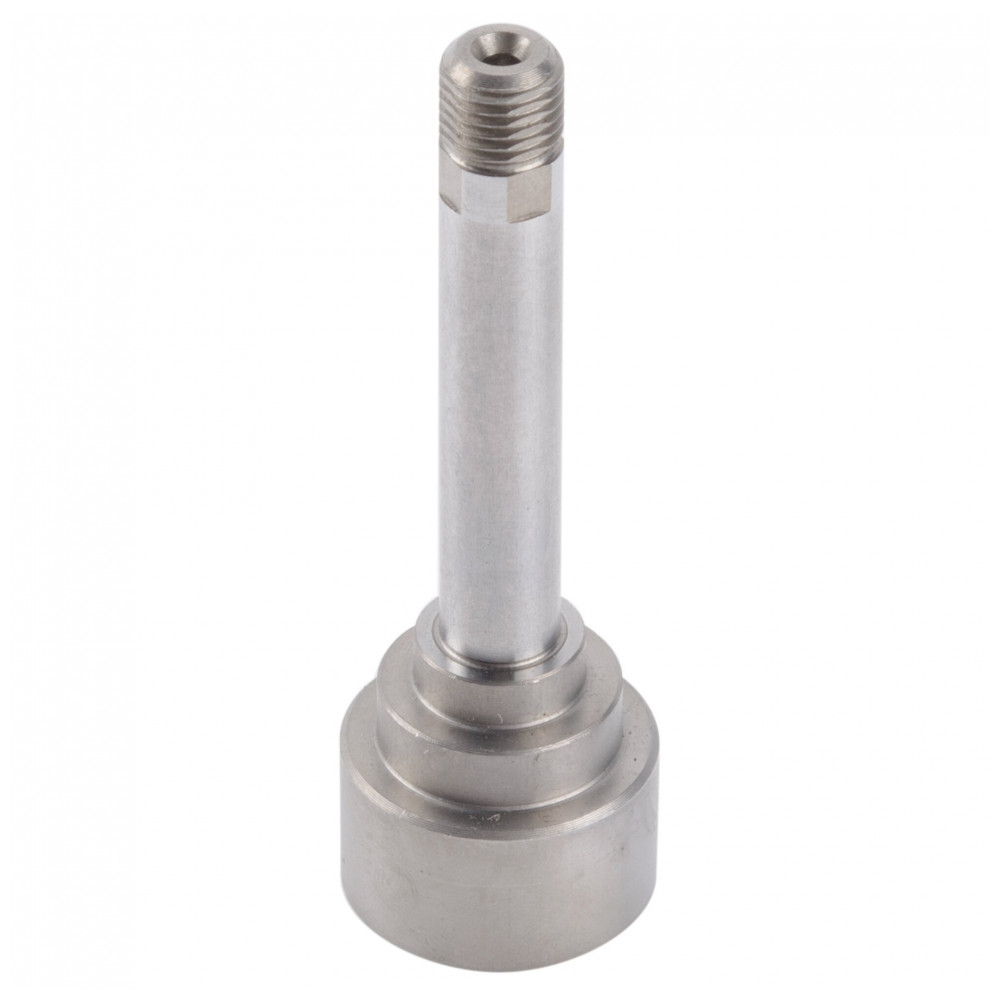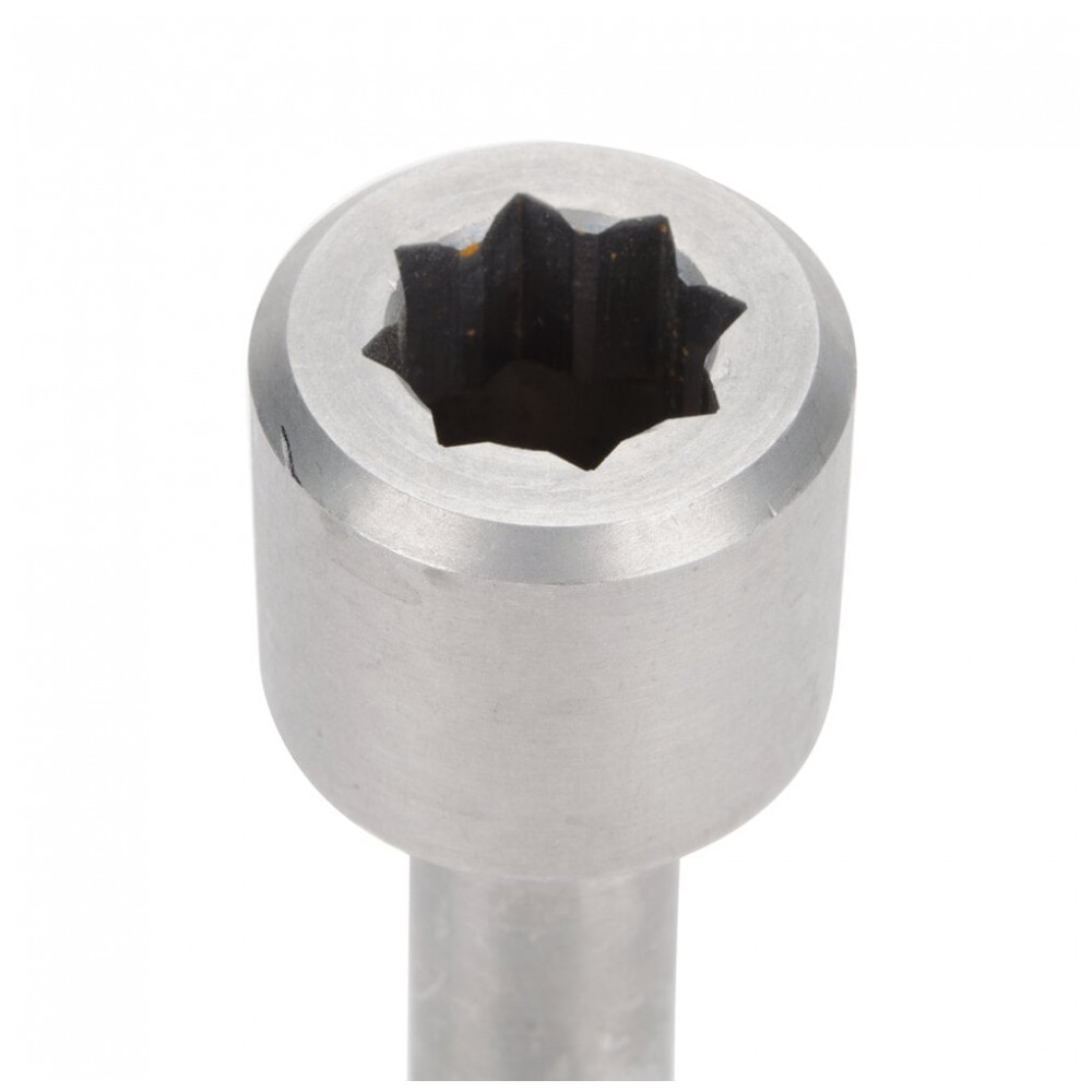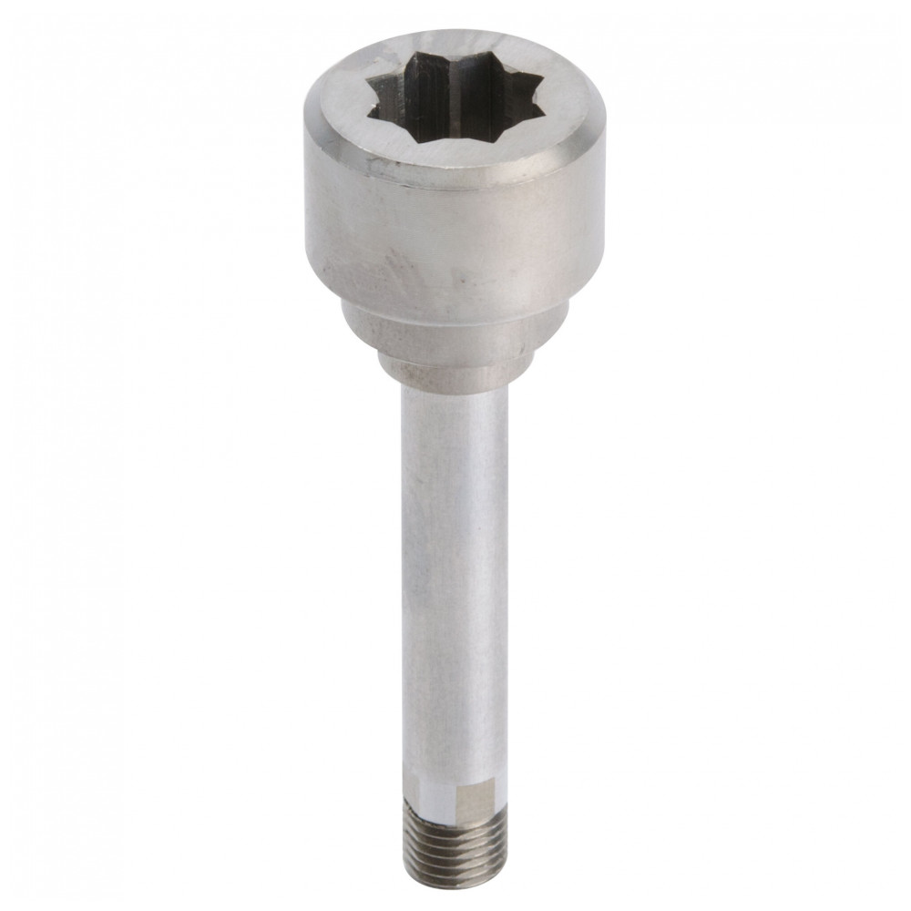 Construído em aço inoxidável 316 com tratamento térmico para resistência a fadiga, apresenta rosca M8 na extremidade superior e spline de 6 dentes na base para transmissão sem folgas.