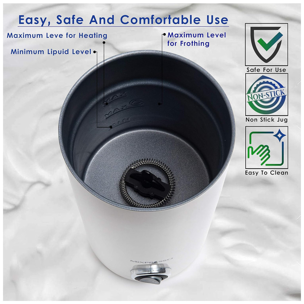 DURÁVEL E RESISTENTE Nós da Mixpresso queremos trazer a você o produto mais e conveniente de usar. Nosso espumador de leite é feito de aço inoxidável de parede dupla para um leite arejado e , a parte externa é revestida com um invólucro de plástico para uma aderência segura e sem aquecimento touch, O bocal interno é composto por um revestimento interno antiaderente que oferece uma limpeza suave e fácil. Este bocal elétrico possui FUNÇÃO DE DESLIGAMENTO automático que o torna o mais possível.