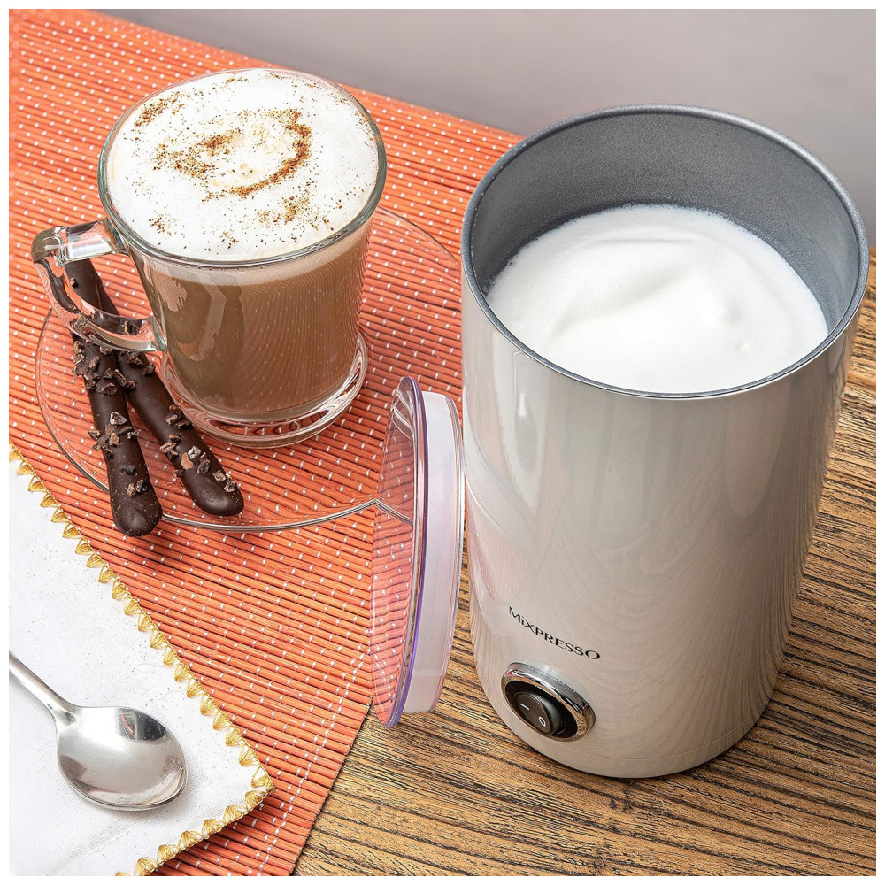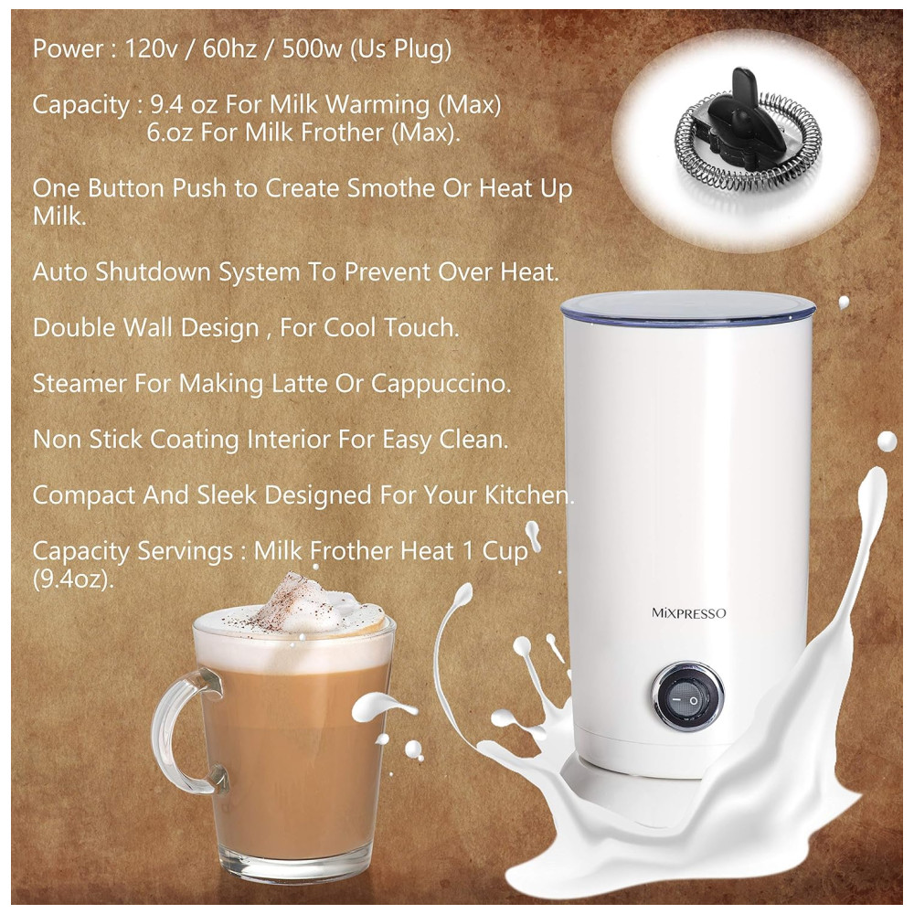 A SOLUÇÃO MAIS RÁPIDA PARA SUA NECESSIDADE Este vaporizador de leite e espumante é a solução perfeita para uma deliciosa xícara de cappuccino. Fornece uma espuma de leite consistente e perfeita, criando pequenas bolhas e uma textura suave. O espumador de leite MIXPRESSO pode aquecer o leite com espuma em cerca de 150 Fahrenheit em segundos, é isso que faz o vaporizador Mixpresso Milk realmente se destacar e vale seu preço.
