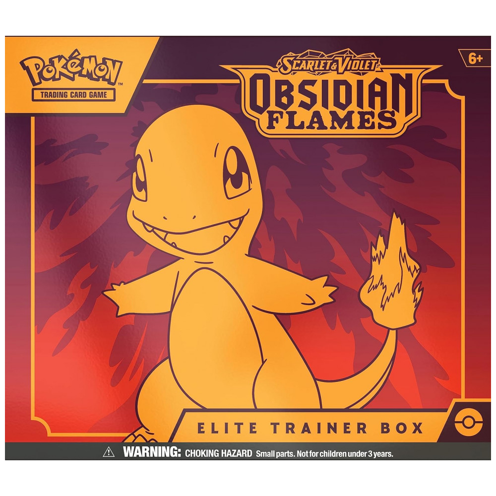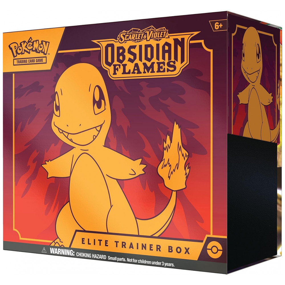 A Elite Trainer Box Pokémon TCG: Scarlet & Violet—Obsidian Flames é um kit de coleção e jogo que reúne boosters, carta promocional, protetores de cartas e acessórios oficiais da expansão Obsidian Flames. O conjunto é temático do Charmander, tanto na carta promo quanto nas artes dos sleeves e da própria caixa.