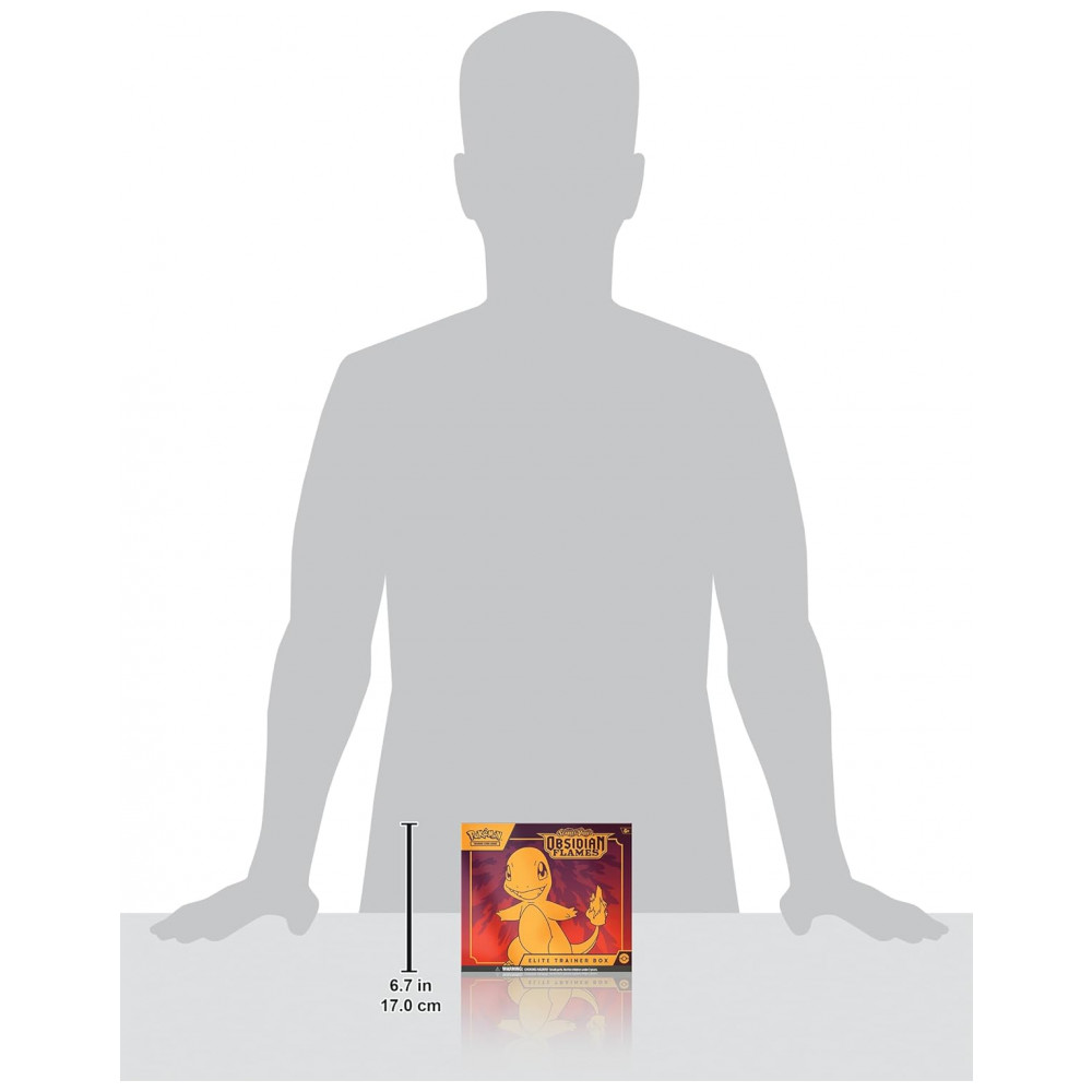 Conteúdo da embalagem: 9 boosters Obsidian Flames, 1 carta promo full-art foil Charmander, 65 sleeves, 45 cartas de Energia, 1 guia do jogador, 1 caixa colecionadora com 4 divisórias, 6 dados de dano, 1 dado de jogo, 2 marcadores de condição e 1 código para Pokémon TCG Live