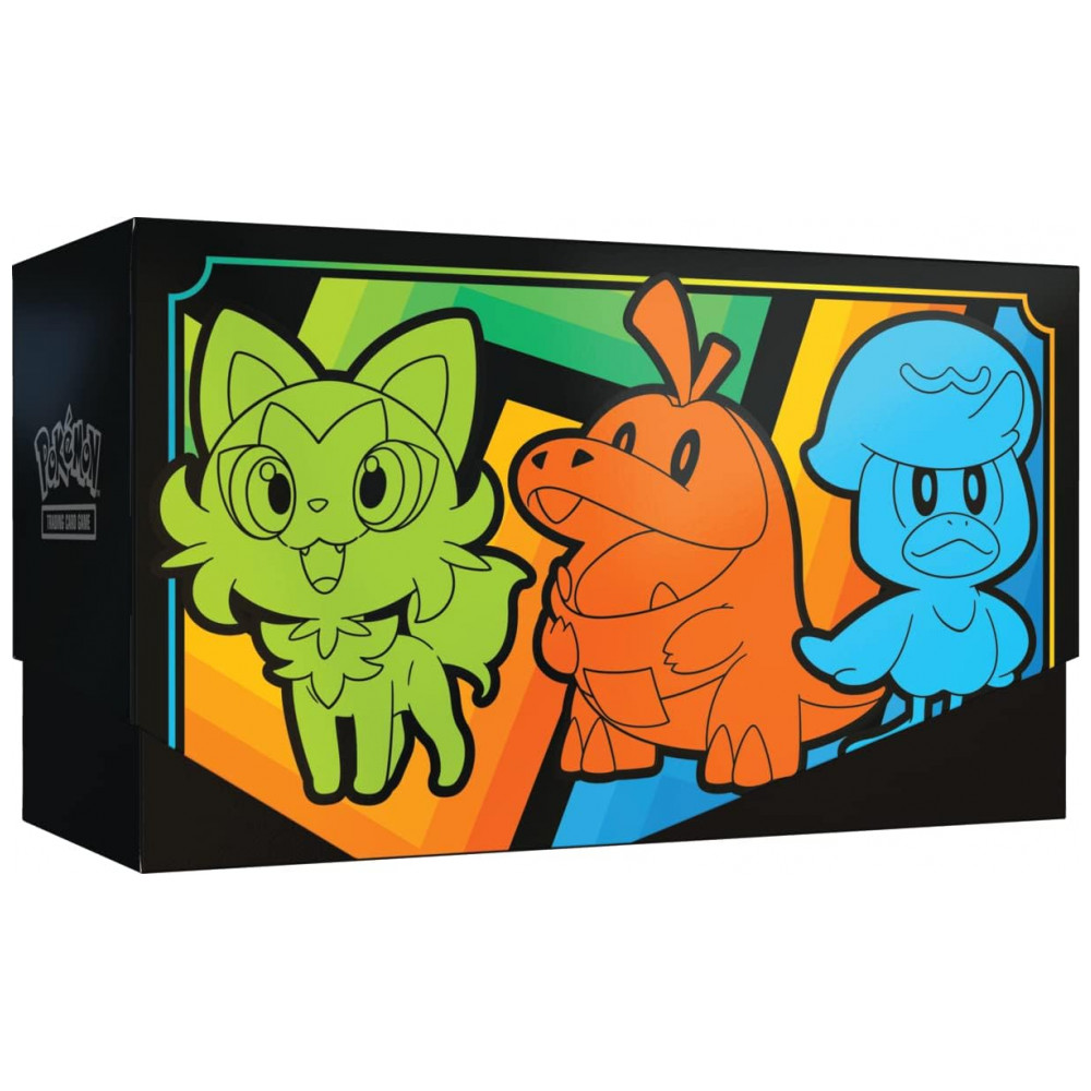 Além das cartas, o kit traz 45 cartas de Energia Pokémon TCG, um guia do jogador da expansão Paldea Evolved, 6 dados de contador de dano, 1 dado de moeda em padrão legal para torneios e 2 marcadores de condição em plástico. Todo o conteúdo vem acondicionado em uma caixa colecionadora com 4 divisórias internas e inclui um código para Pokémon Trading Card Game Live.
