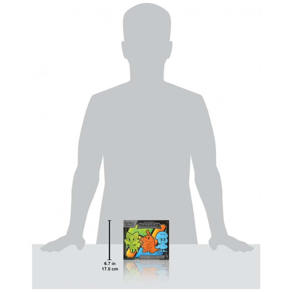 Conteúdo da embalagem: 9 boosters Paldea Evolved, 1 carta promo full-art Pikachu, 65 sleeves, 45 cartas de Energia, 1 guia do jogador, 6 dados de dano, 1 dado de jogo, 2 marcadores de condição, 1 caixa colecionadora com divisórias e 1 código para Pokémon TCG Live