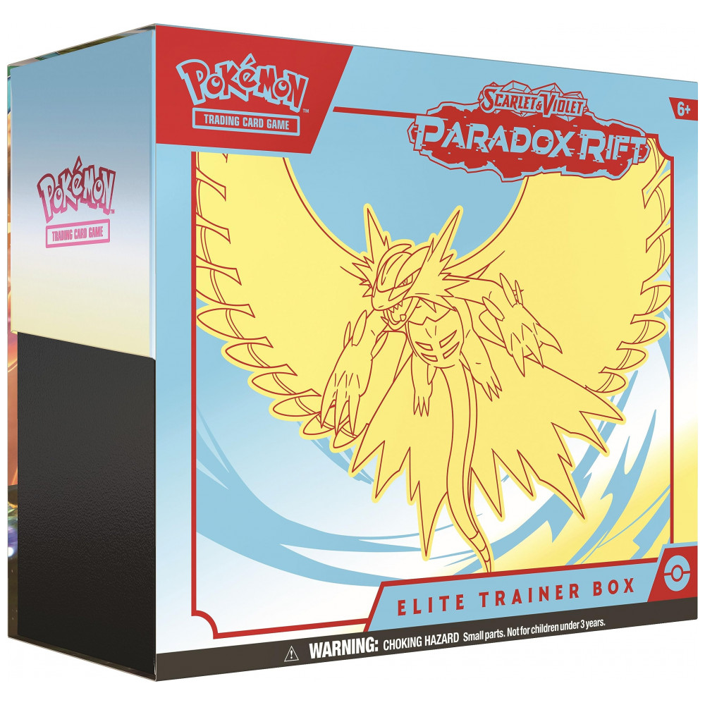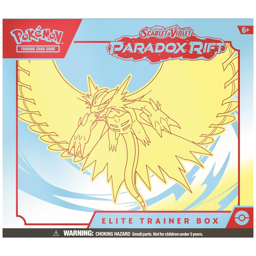 A Elite Trainer Box Pokémon TCG: Scarlet & Violet—Paradox Rift é um kit de coleção e jogo que reúne boosters, carta promocional, protetores de cartas e acessórios de partida da expansão Paradox Rift. Cada unidade vem, de forma aleatória, com arte temática de Iron Valiant ou Roaring Moon, alterando o visual da caixa e dos sleeves inclusos.