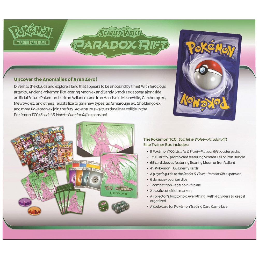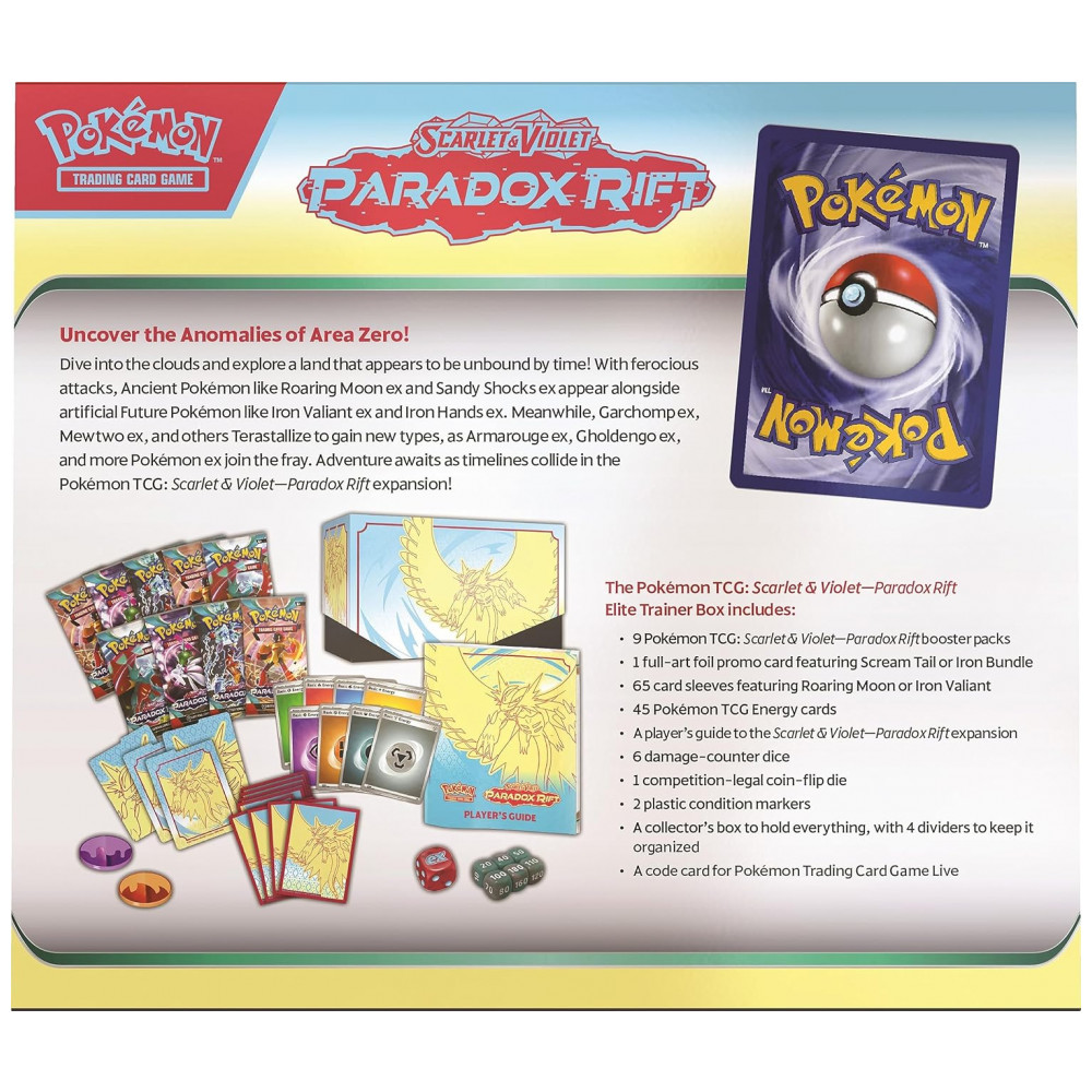 Conteúdo da embalagem: 9 boosters Paradox Rift, 1 carta promo full-art foil, 65 sleeves, 45 cartas de Energia, 1 guia do jogador, 1 caixa colecionadora com 4 divisórias, 6 dados de dano, 1 dado de jogo, 2 marcadores acrílicos de condição, 1 código para Pokémon TCG Live
