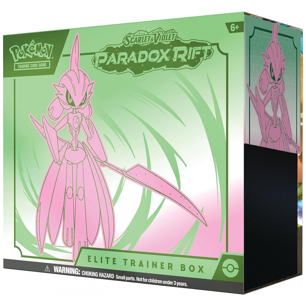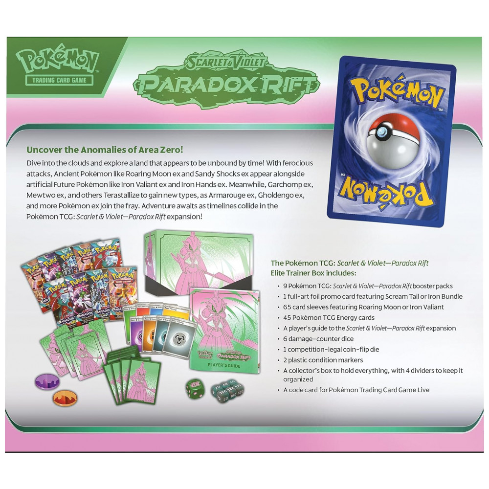 Conteúdo da embalagem: 9 boosters Paradox Rift, 1 carta promo full-art foil, 65 sleeves, 45 cartas de Energia, 1 guia do jogador, 1 caixa colecionadora com divisórias, 6 dados de dano, 1 dado de jogo, 2 marcadores de condição e 1 código para Pokémon TCG Live