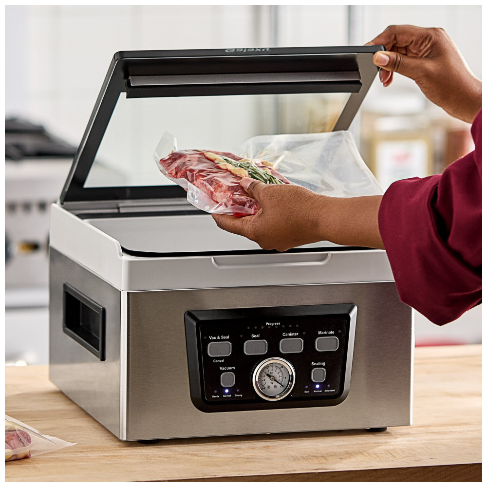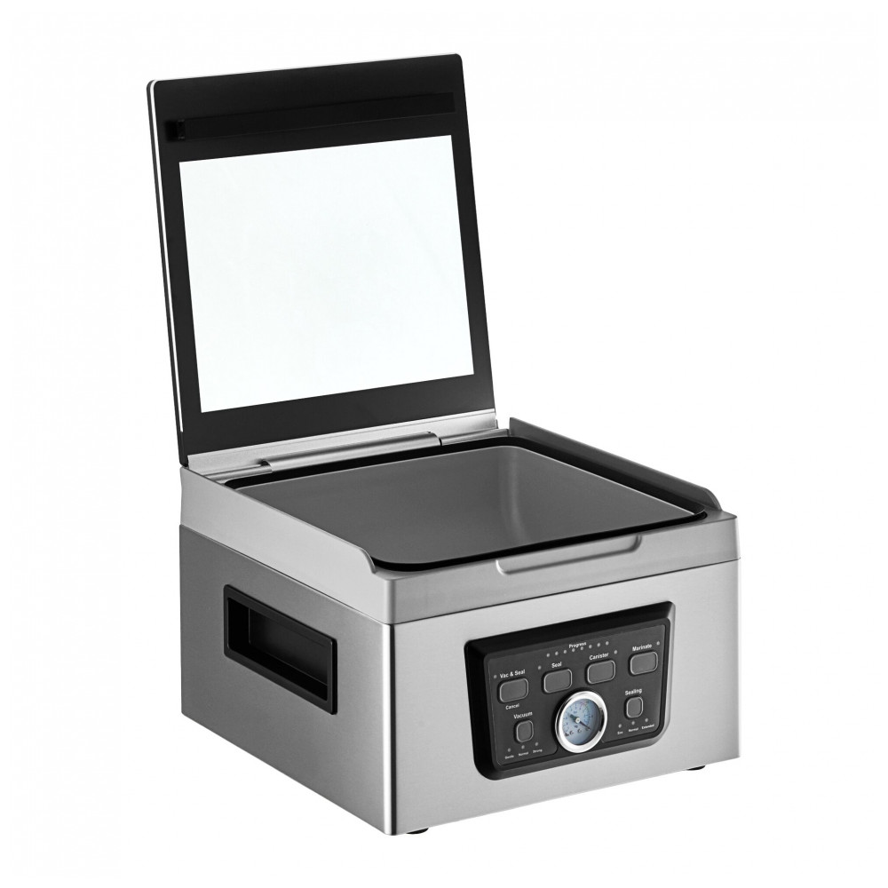O modelo apresenta câmara de 29,2 x 28,6 x 22,5 cm, tampa acrílica transparente, dispositivo de fixação de saco e mangueira vácuo de 45 cm. Construção em aço inoxidável, inclui 20 sacos 20×25 cm e porta para canister vácuo (vendido separadamente).