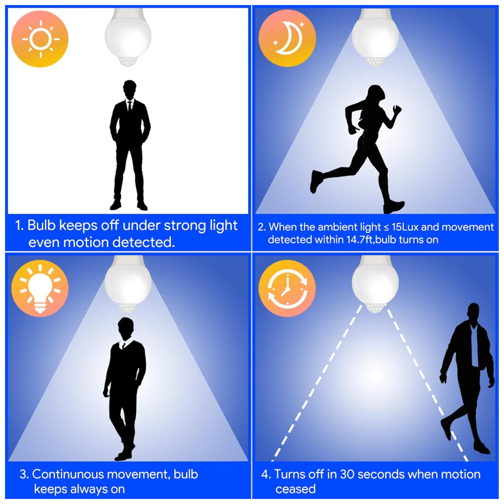 Ativação automática quando o detector detecta um objeto em movimento a 14,7 pés e desligamento automático após 30 segundos sem movimento. A lâmpada de movimento acenderá apenas quando estiver escuro o brilho inferior a 15 Lux e quando o movimento é detectado