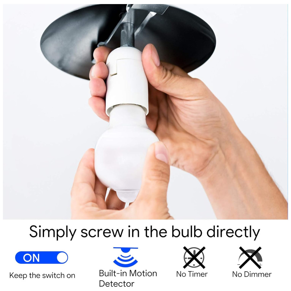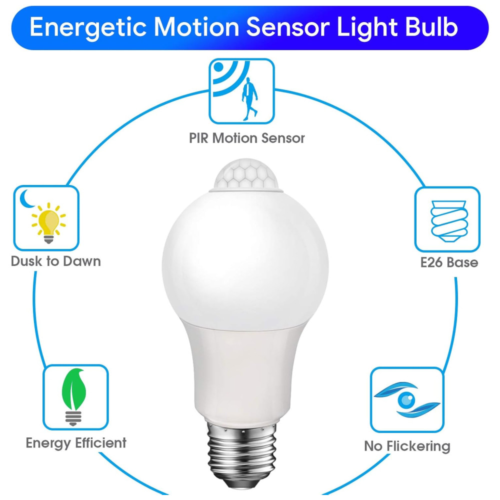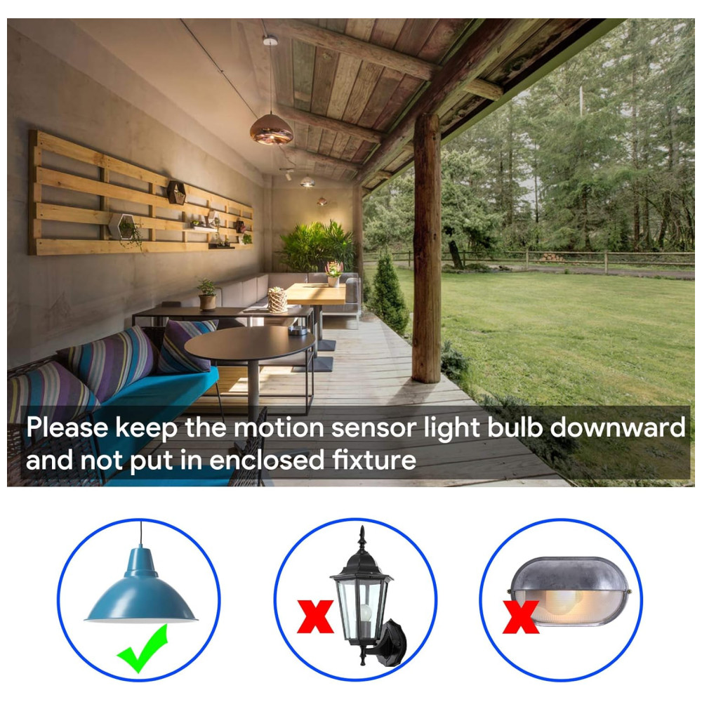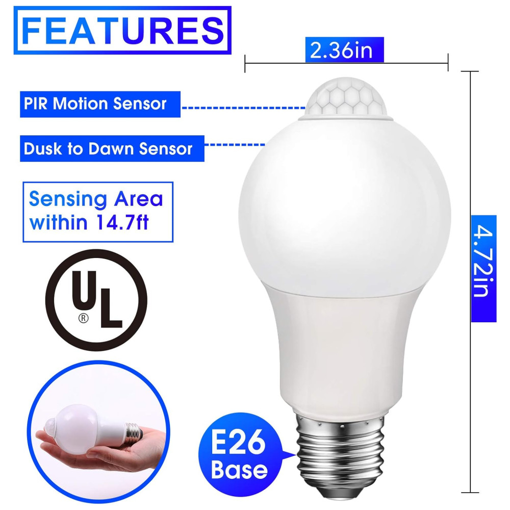 Recursos Lâmpada com sensor de movimento, base de parafuso médio E26 padrão, equivalente a 60 watts, luz do dia de 5000K, 800 lumens, CRI 83, AC 120V, acende em 0,1 segundos, classificação de umidade localizada
