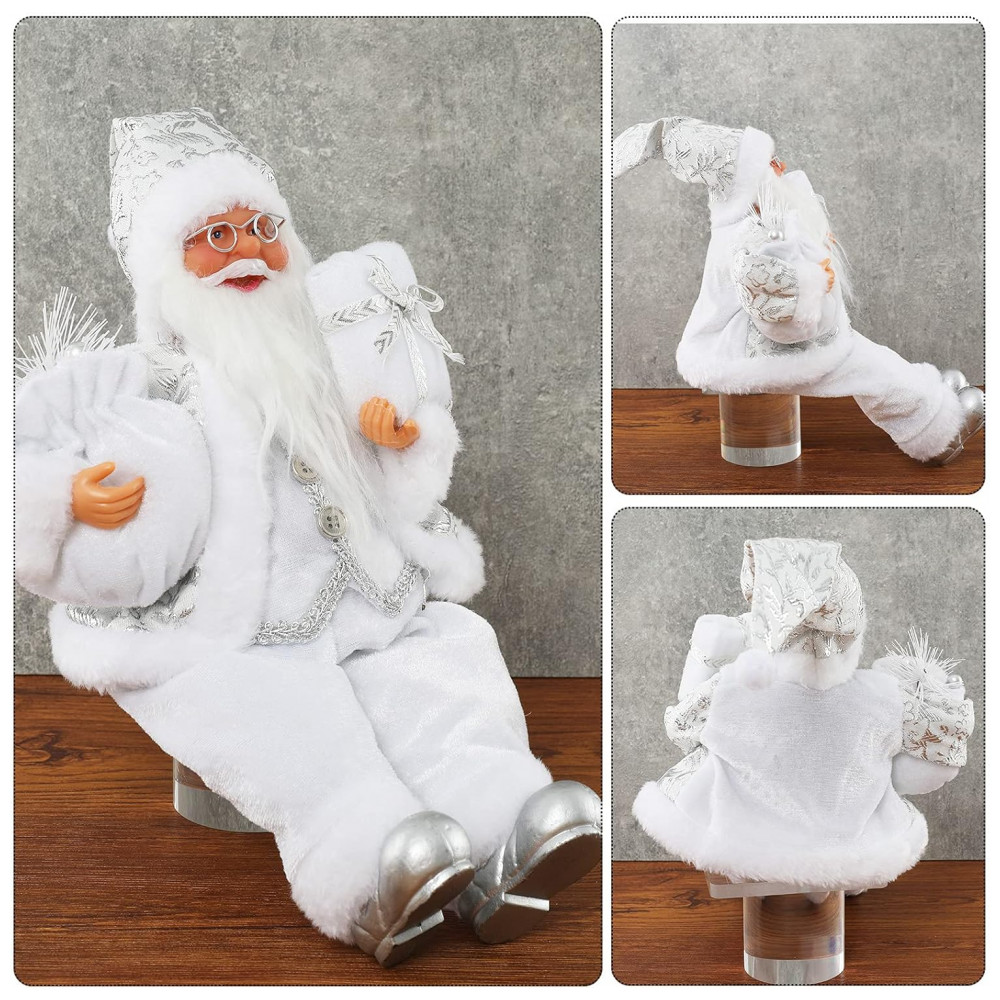 Este adorável Papai Noel sentado é vestido com um elegante casaco branco e prata, acompanhado de um chapéu bem trabalhado, segurando uma bolsa de presente e um presente. Extremamente fofo e chique, ele cria uma forte atmosfera festiva de Natal. Perfeito para decorar lareiras, mesas, estantes e outros locais elevados. Encante-se ao vê-lo sentado no topo, protegendo a casa ao redor de uma calorosa lareira. Feito de plástico e tecido de alta qualidade, durável e seguro, este Papai Noel é uma ótima opção de presente para familiares e amigos, trazendo boa sorte, felicidade e calor. Com 30cm de comprimento, incluindo as pernas, é perfeito para enfeitar mesas, exibições em janelas, árvores de Natal ou qualquer outro lugar como um adorno natalino.