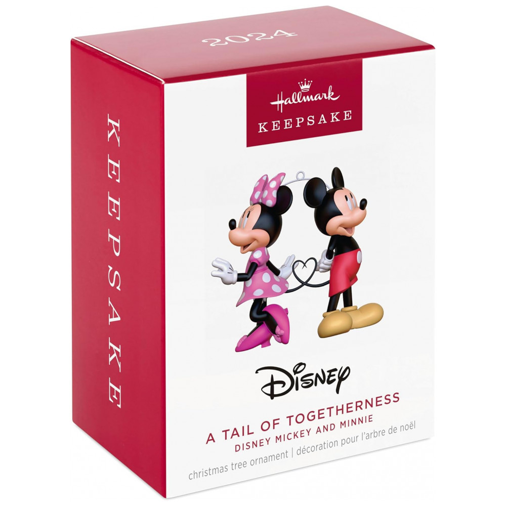 O enfeite natalino Hallmark Keepsake Um Conto de União apresenta Mickey e Minnie Mouse celebrando união e afeto, formando um coração com seus rabos. Produzido em plástico de alta qualidade com acabamento detalhado, é ideal para colecionadores e decoração temática de árvores de Natal. O produto acompanha embalagem específica, facilitando o presente, armazenamento e conservação. Indicado para adultos e fãs Disney, não requer montagem nem baterias, e possui fixação por haste pendurável.
