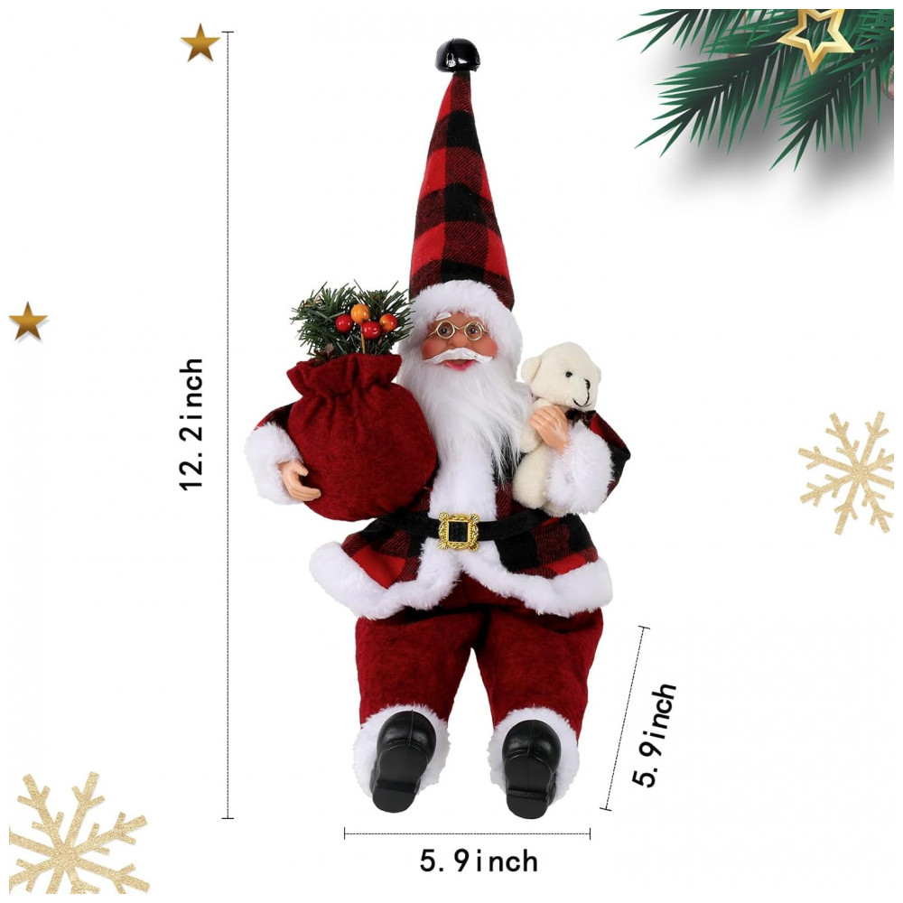 O adorável Papai Noel sentado da AnyDesign está vestido com um traje elegante de inverno xadrez vermelho, completo com um chapéu bem elaborado, segurando um saco de presente e um ursinho, super fofo e chique, atraente e adorável, trazendo uma forte atmosfera festiva de Natal. Perfeito para decorar a lareira, mesa, estante ou prateleira mais alta. Será encantador vê-los sentados no topo a guardar a lareira ao redor de um fogo aconchegante. O enfeite de Papai Noel é uma ideia perfeita de decoração para o Natal. O Papai Noel de Natal é considerado como um símbolo de boa sorte, sendo um ótimo presente para levar prosperidade às famílias e amigos. Feito de material macio e durável, ecofriendly e seguro, pode ser colocado em casa, no escritório ou ser um presente para sua família e amigos. Ele adicionará um toque de luxo natalino a qualquer lar e atende a todas as idades. Com 31cm de comprimento, incluindo as pernas, é o tamanho ideal para ser colocado em uma mesa, em uma vitrine, em uma árvore de Natal ou em qualquer outro lugar como enfeite natalino.