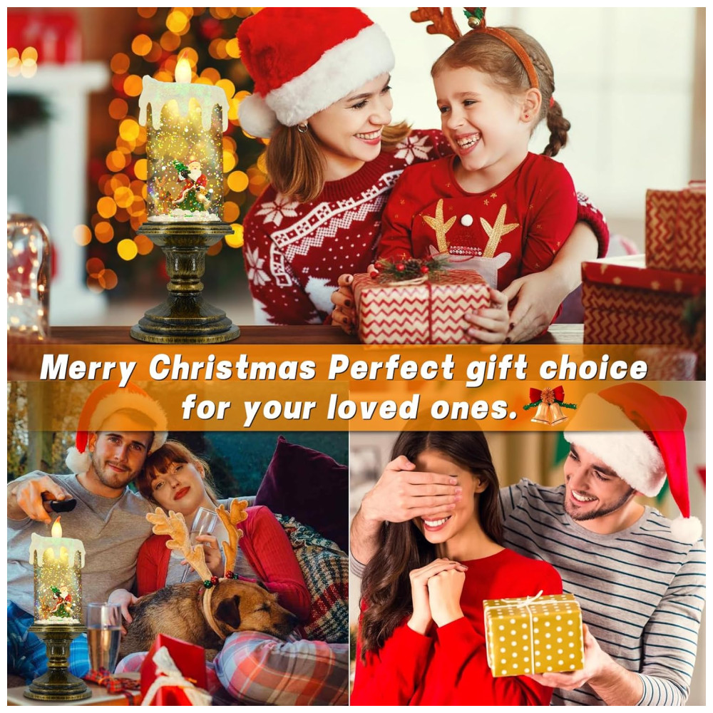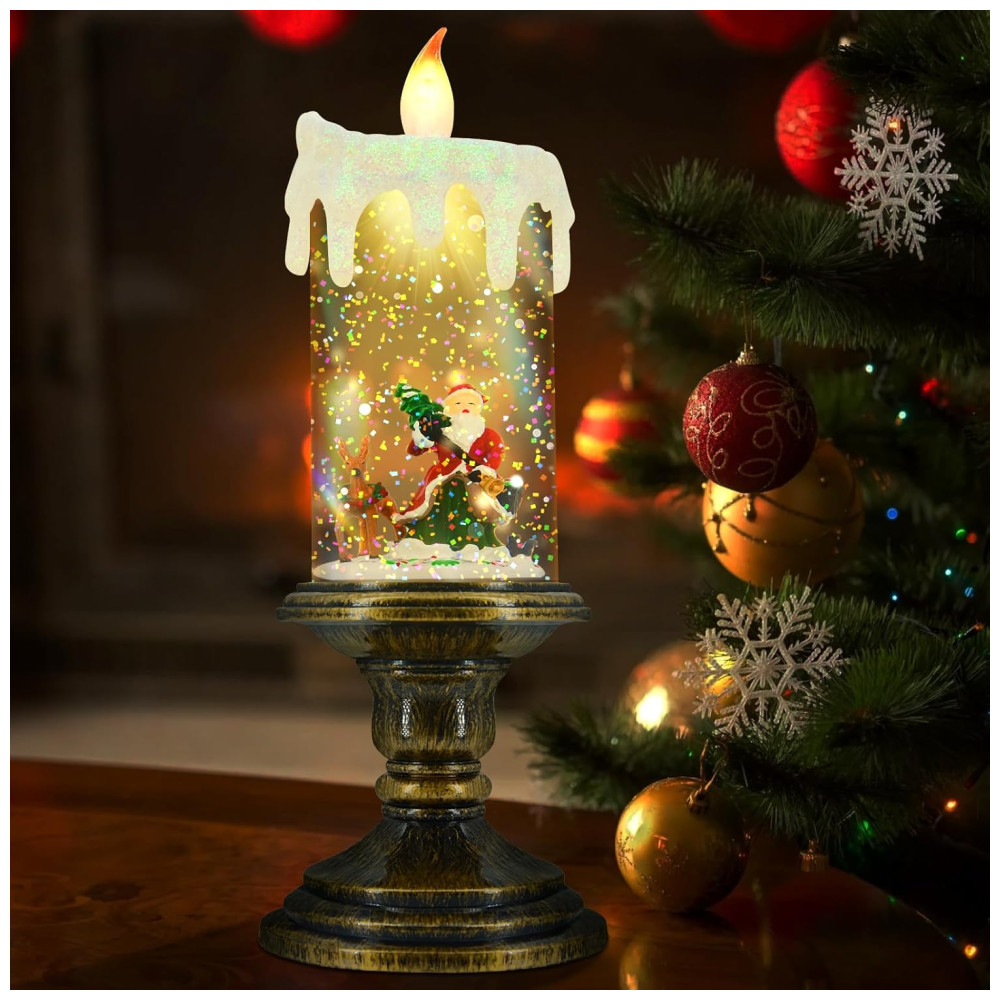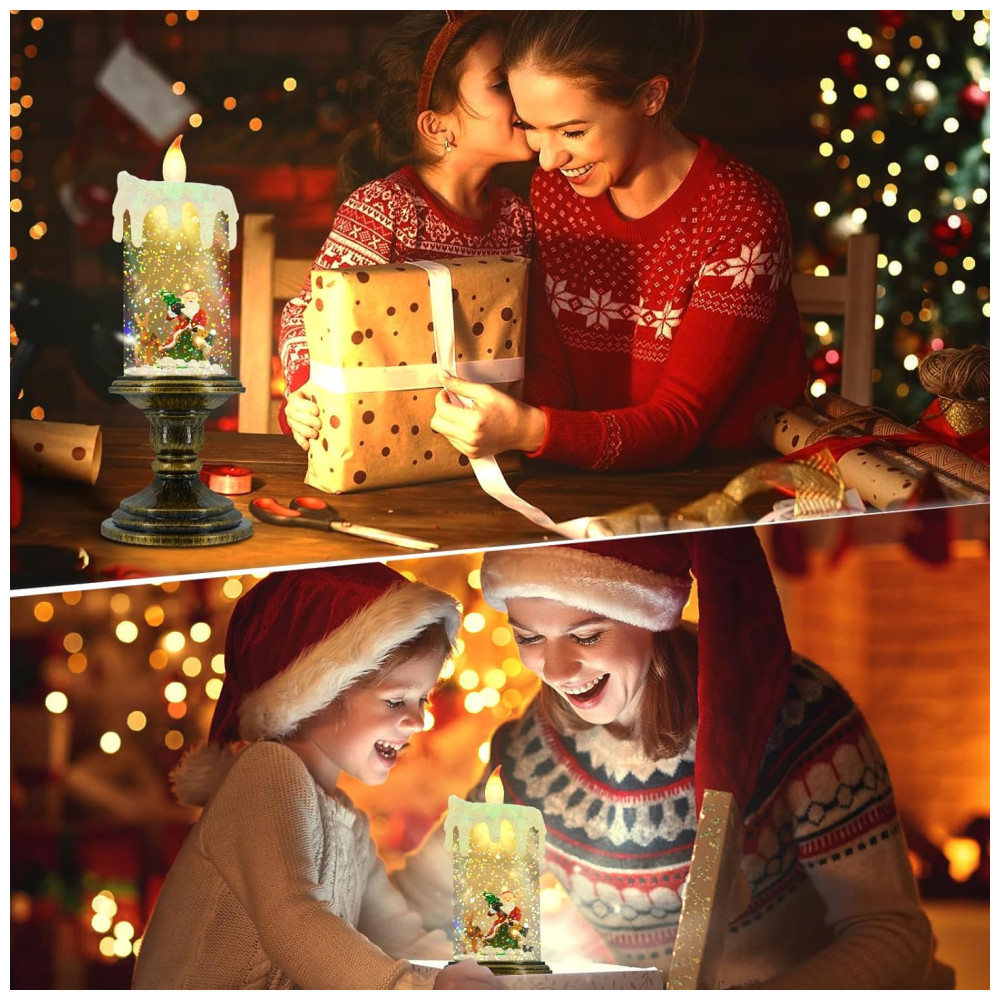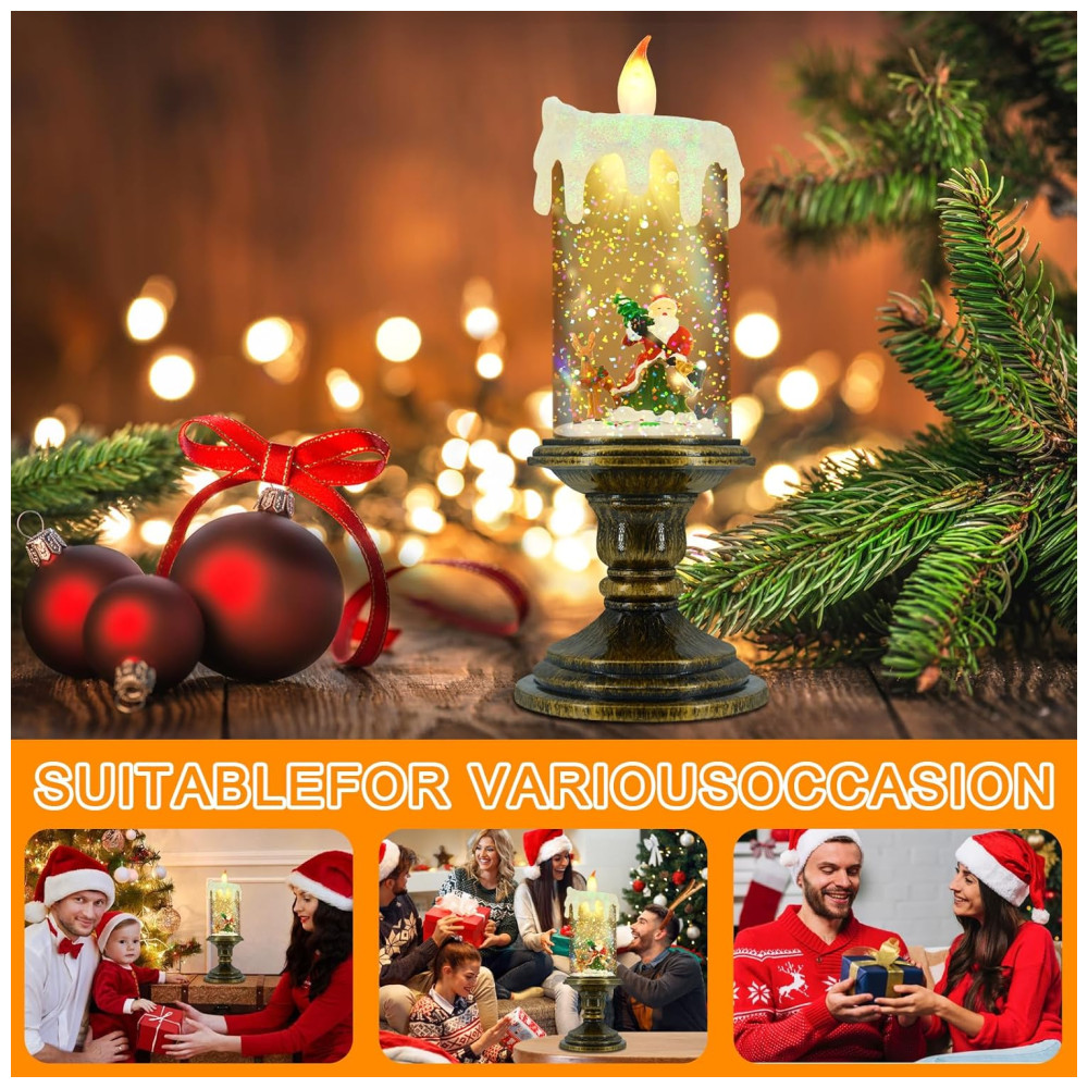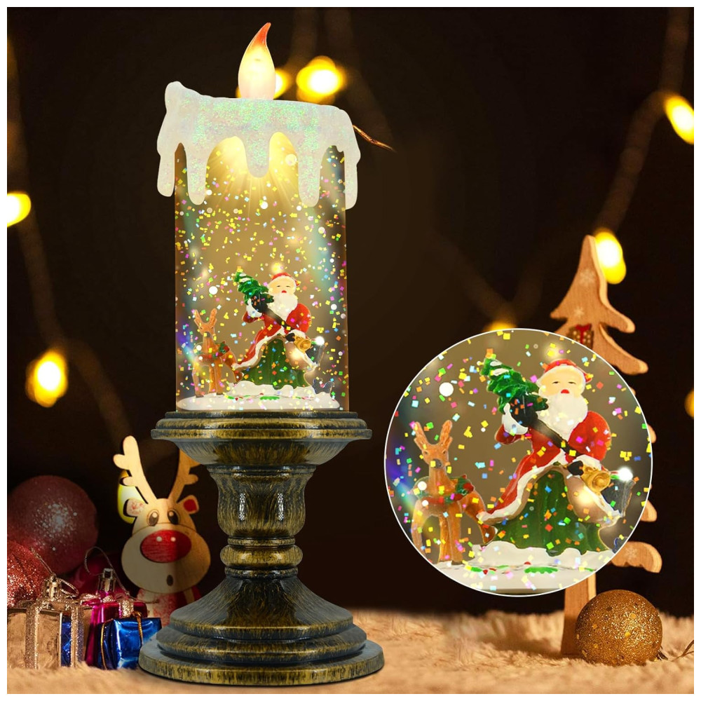 O motor embutido nas velas de LED permite que o glitter gire automaticamente, criando um efeito semelhante à neve caindo. Além disso, há um lindo Papai Noel esculpido e pintado à mão dentro de cada vela transparente.