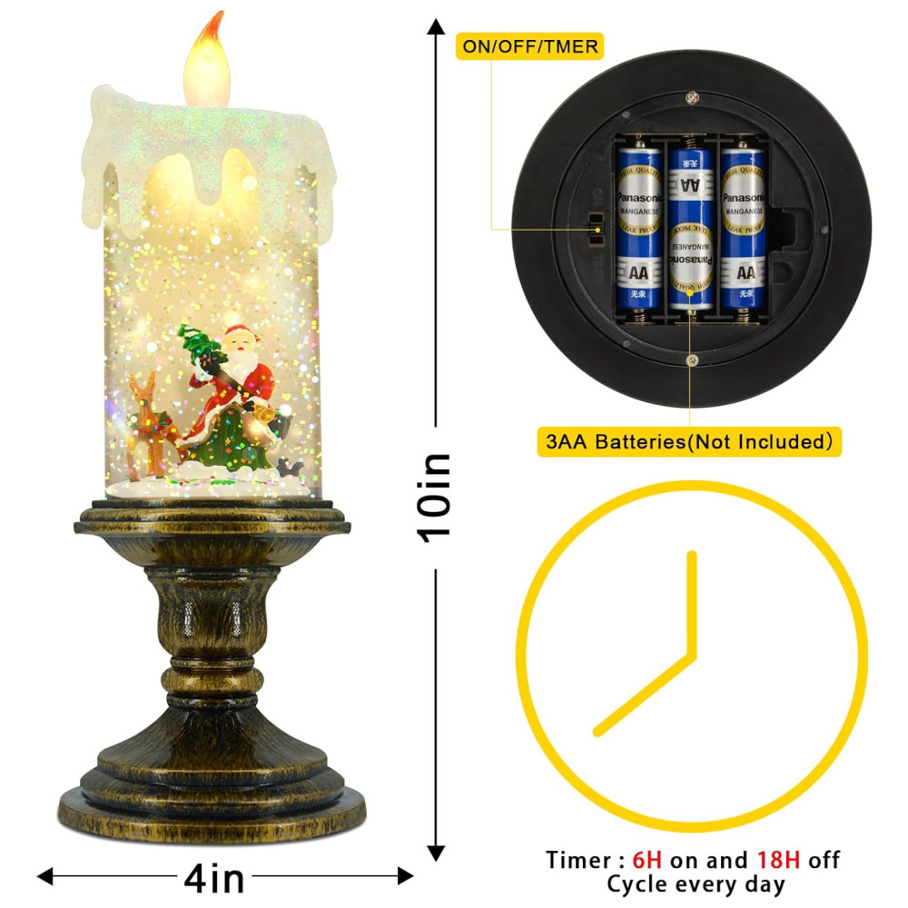 Estas velas de LED sem chama são perfeitas para decorar sua casa durante as festas de Natal. Com um diâmetro de 4 polegadas e altura de 10 polegadas, elas são feitas de resina e plástico, com água e glitter adicionados para um efeito deslumbrante. O design vintage das velas apresenta luzes de vela realistas, proporcionando uma aparência elegante e atraente.