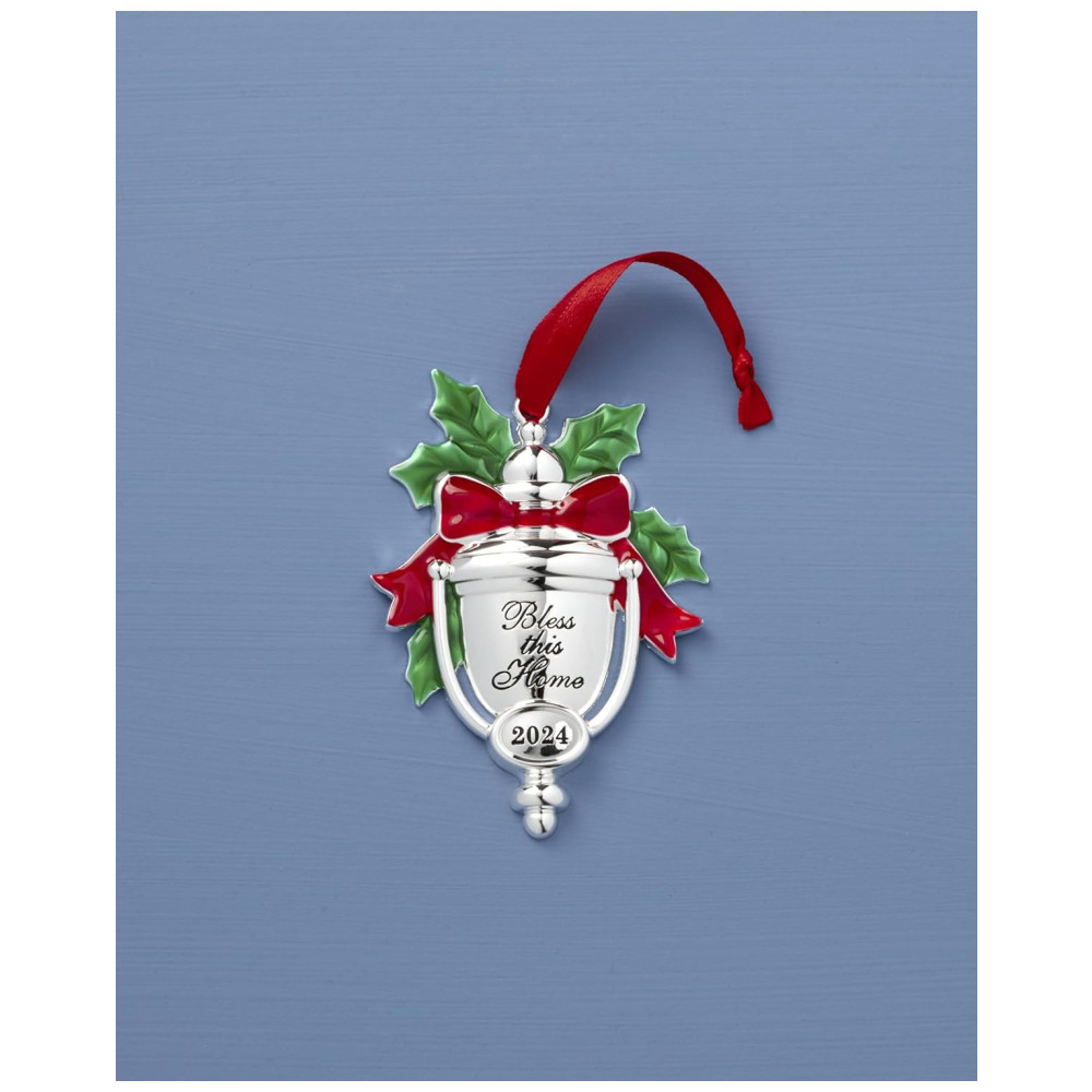 Adorne sua casa com este belíssimo ornamento banhado a prata que apresenta uma aldrava vintage decorada com folhas vibrantes de azevinho verde e um laço vermelho festivo. Feito de chapa de prata e aço inoxidável, este enfeite vem com uma fita vermelha para pendurar e é perfeito para uso decorativo. O pacote inclui 1 enfeite que mede 9,53 cm x 1,27 cm x 9,53 cm e é importado. Deixe sua casa mais bonita nesta temporada