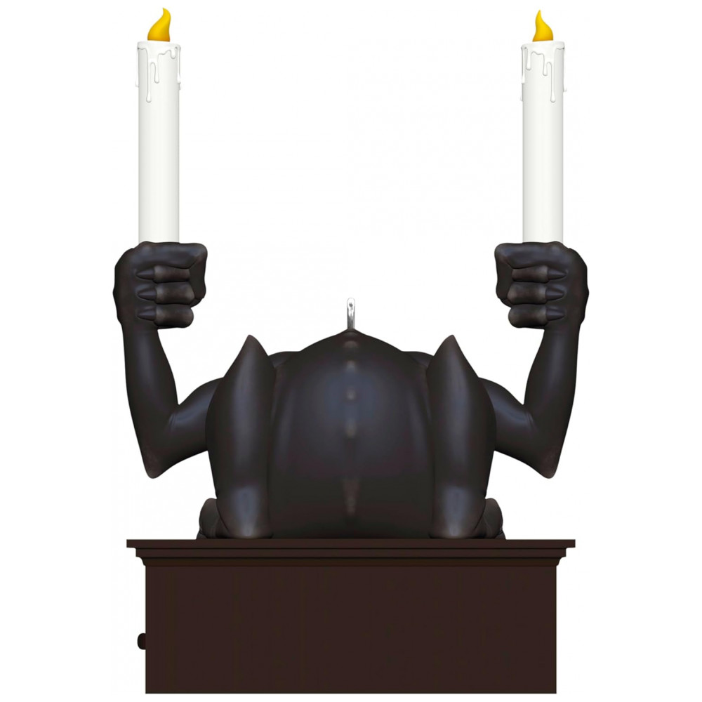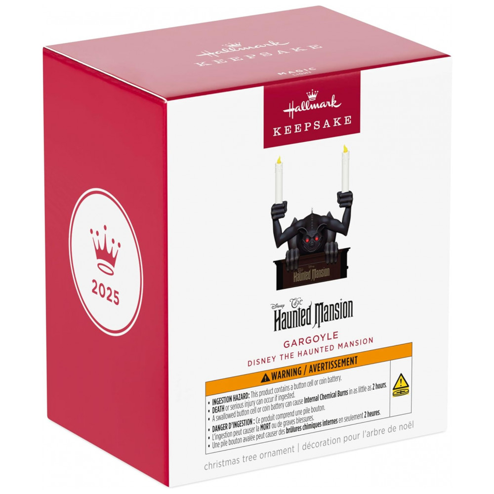 Adicione um toque sombrio e elegante à sua decoração natalina com este enfeite oficial Hallmark Keepsake 2025, inspirado na icônica estátua de gárgula da atração Disney The Haunted Mansion. Este enfeite em plástico apresenta detalhes intricados do gargoyle segurando castiçais, com olhos que brilham em vermelho e velas que acendem ao pressionar um botão, proporcionando uma aura misteriosa e festiva. Alimentado por três pilhas alcalinas LR44 incluídas, ele proporciona um efeito iluminado que chama a atenção e captura o espírito assustador e divertido das férias. É uma peça excelente para colecionadores e fãs da Disney que apreciam a combinação de magia natalina com o toque clássico do lado sombrio. A peça vem com gancho para pendurar e embalagem para presente Hallmark.