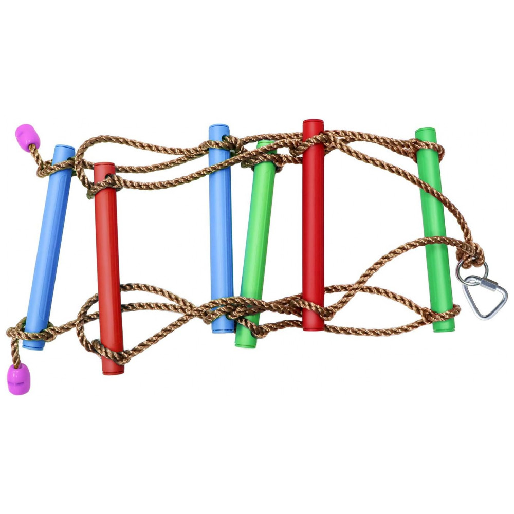 A escada de corda Rainbow Craft de 2 metros em multicolor serve como acessório para cursos ninja warrior, casas na árvore, conjuntos de balanço e playgrounds infantis. Fabricada em polipropileno reforçado com ganchos metálicos, suporta até 100 kg e permite instalação rápida em slacklines, barras de macaco, redes de carga ou estruturas de brincadeira externa. Indicada para crianças de 3 a 12 anos, adapta-se a atividades internas ou ao ar livre em quintais e parques.
