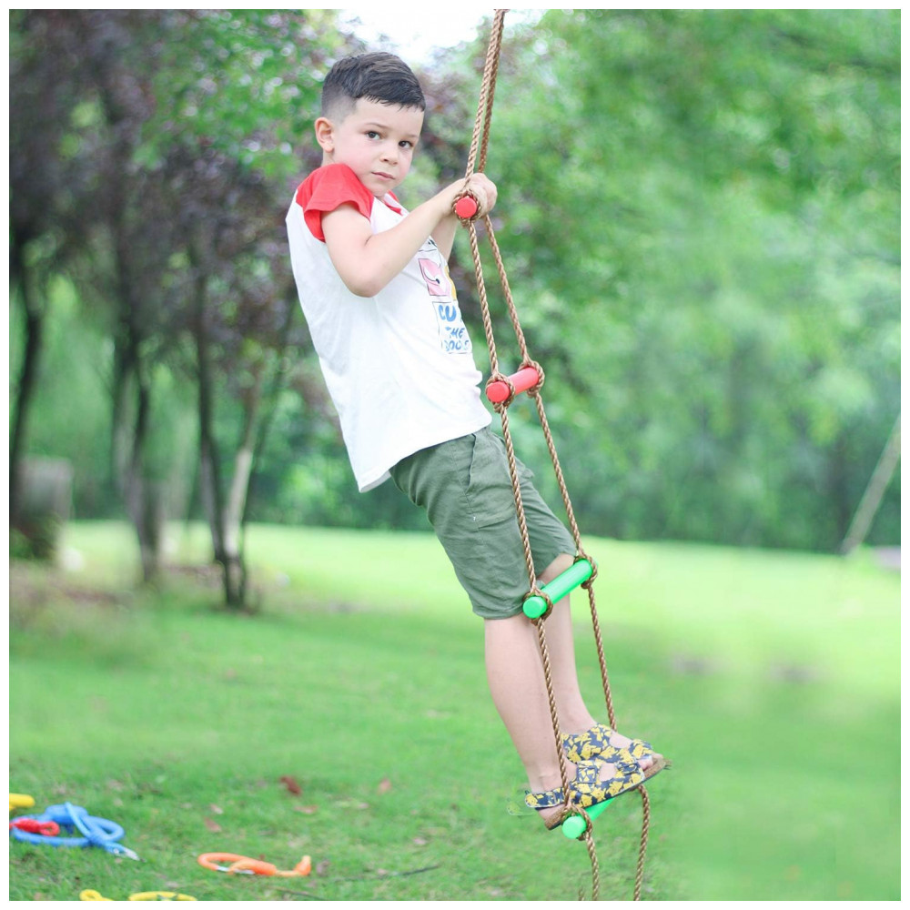 Compatível com acessórios ninja como anéis, punhos ninja, redes de carga e rodas de balanço, a escada integra-se a conjuntos completos de obstáculos infantis. Portátil pelo volume reduzido, permite transporte e armazenamento prático.