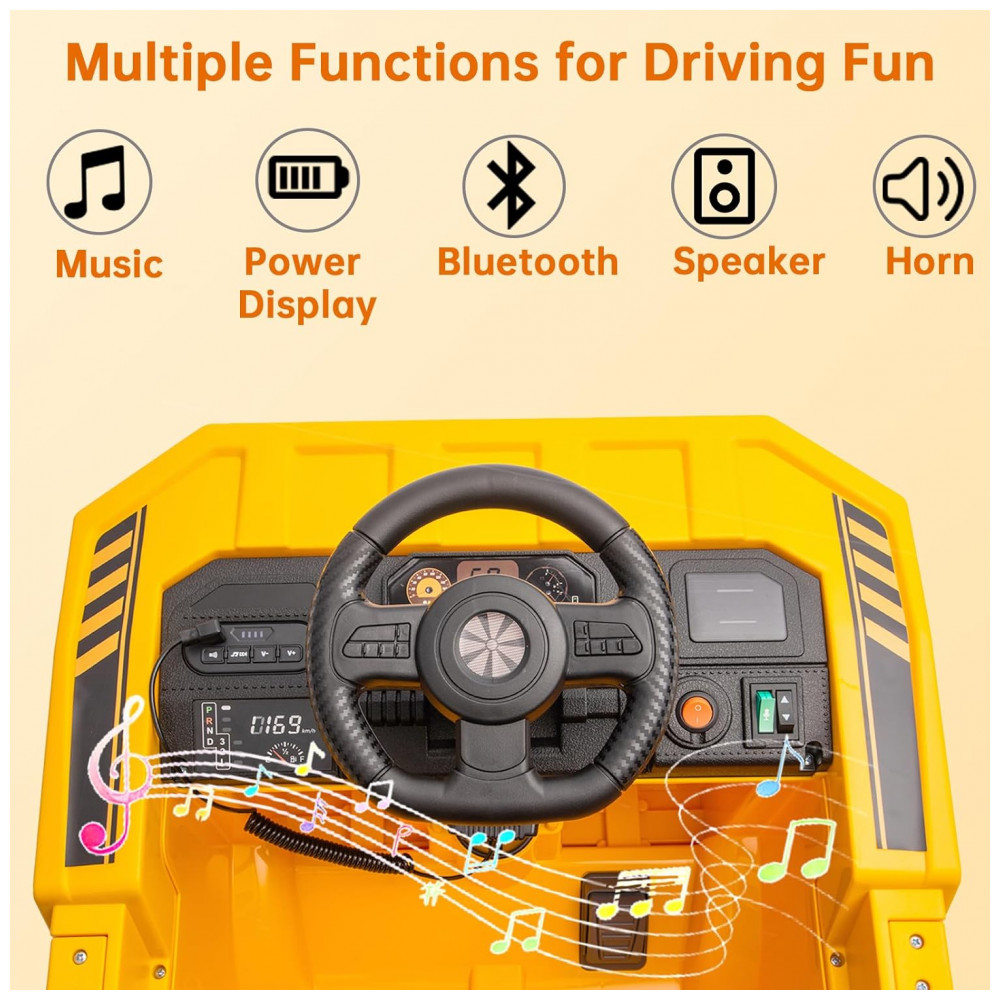 MÚLTIPLAS FUNÇÕES ATRATIVAS O passeio no trator AOKOY vem com interruptor de velocidade, alavanca para frente e para trás, música embutida, proporcionando uma experiência de direção mais interessante. Equipado com porta USB, entrada AUX para cartão TF, este brinquedo infantil de 12V pode ser conectado ao seu dispositivo para reproduzir qualquer música ou história que você desejar.
