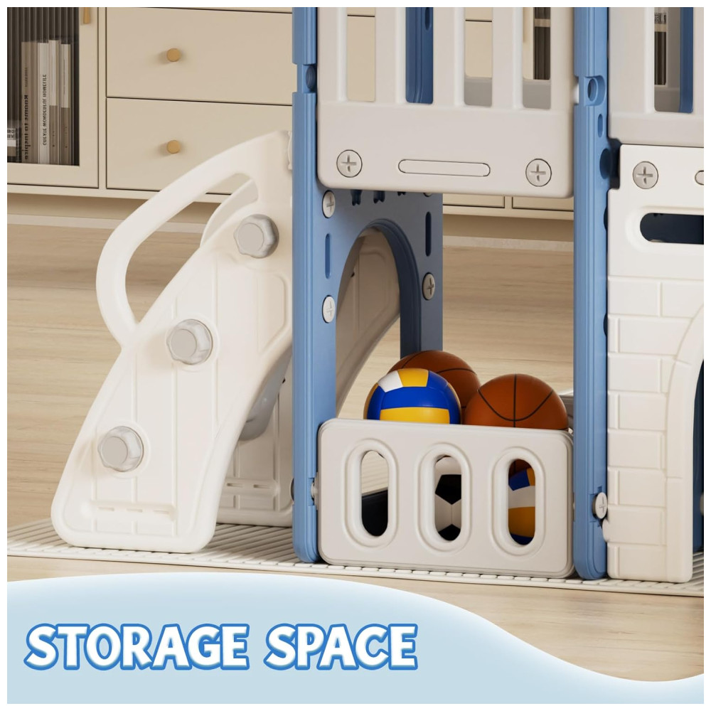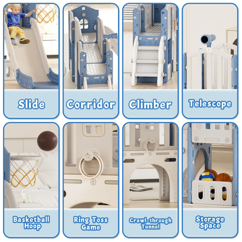 Playground 9 em 1 para Bebês: O escorregador possui 9 áreas de atividades, incluindo escadas, escorregador, 2 espaços para armazenamento, jogo de argolas, área de basquete, corredor, painel de jogos, telescópio e área de escalada na parte inferior.