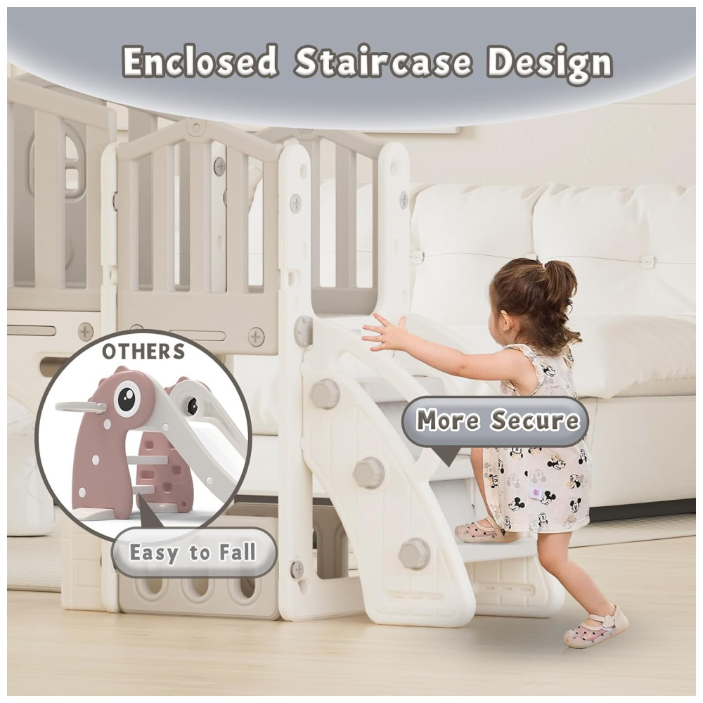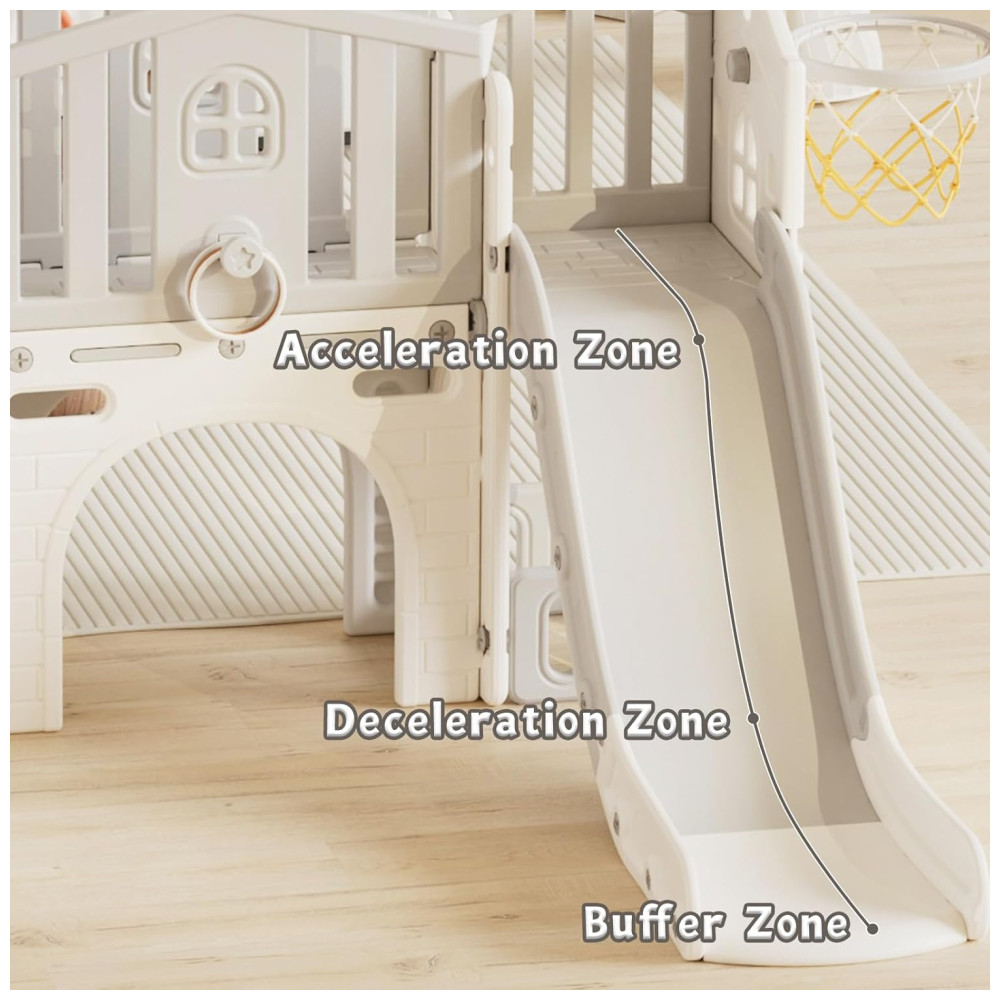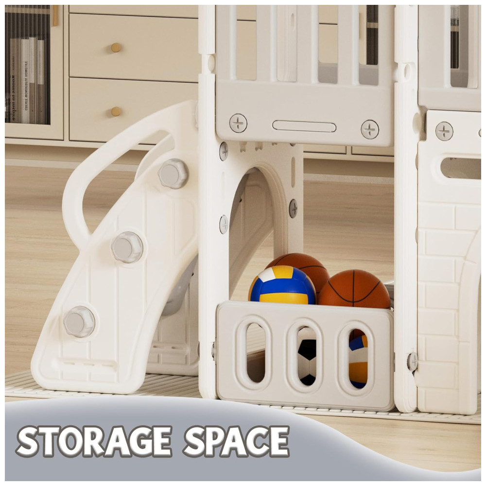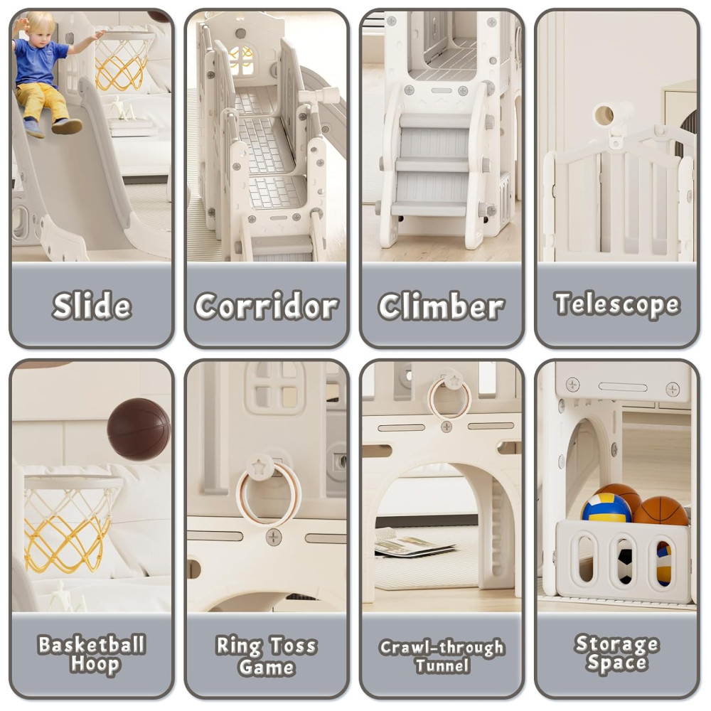 Playground 9 em 1 para Bebês: O escorregador possui 9 áreas de atividades, incluindo escadas, escorregador, 2 espaços para armazenamento, jogo de argolas, área de basquete, corredor, painel de jogos, telescópio e área de escalada na parte inferior.