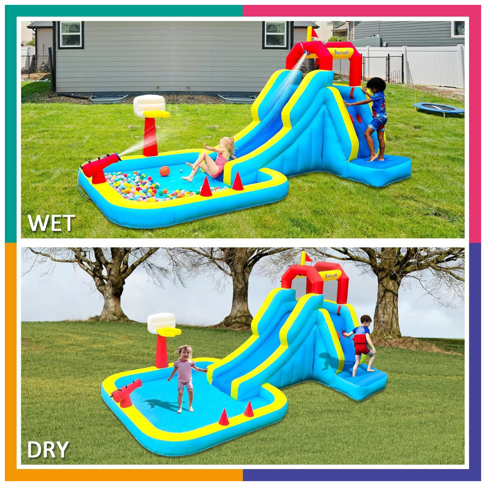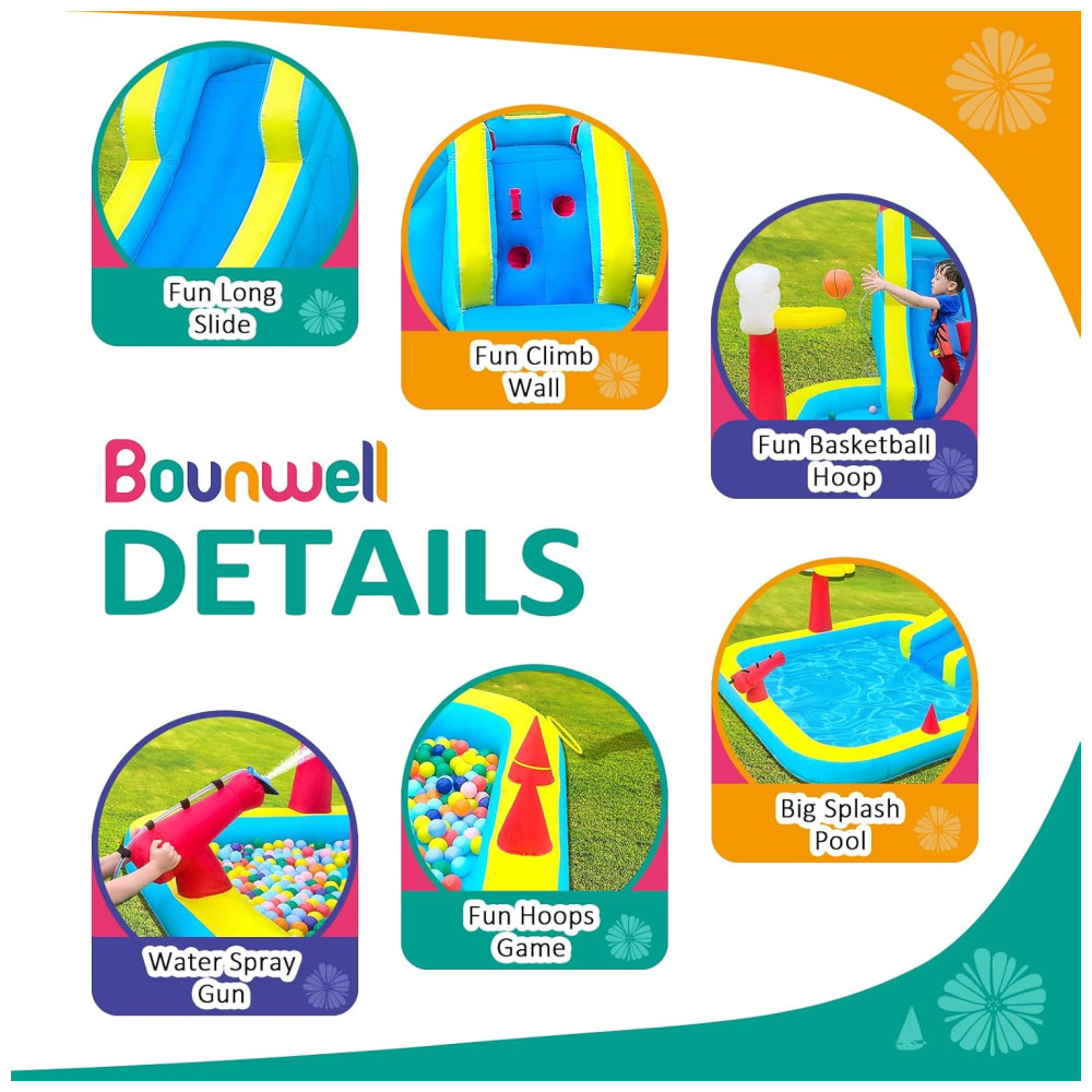 Escorregador Bounwell Inflável com Parede de Escalada Tiro de Água Cesta de Basquete e Piscina Splash – Diversão Garantida para Crianças no Quintal.