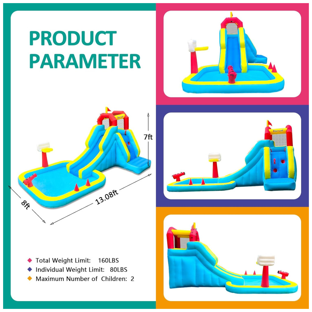 Com dimensões de 2,1 x 2,4 x 3,98 m, este escorregador inflável para quintal oferece diversas formas de diversão: escorregador, parede de escalada, cesta de basquete, piscina splash, tiro de água e dois postes para jogo de argolas. Ideal para recreação em família, garantindo horas de entretenimento para as crianças. Limite máximo de peso total: 72 kg.