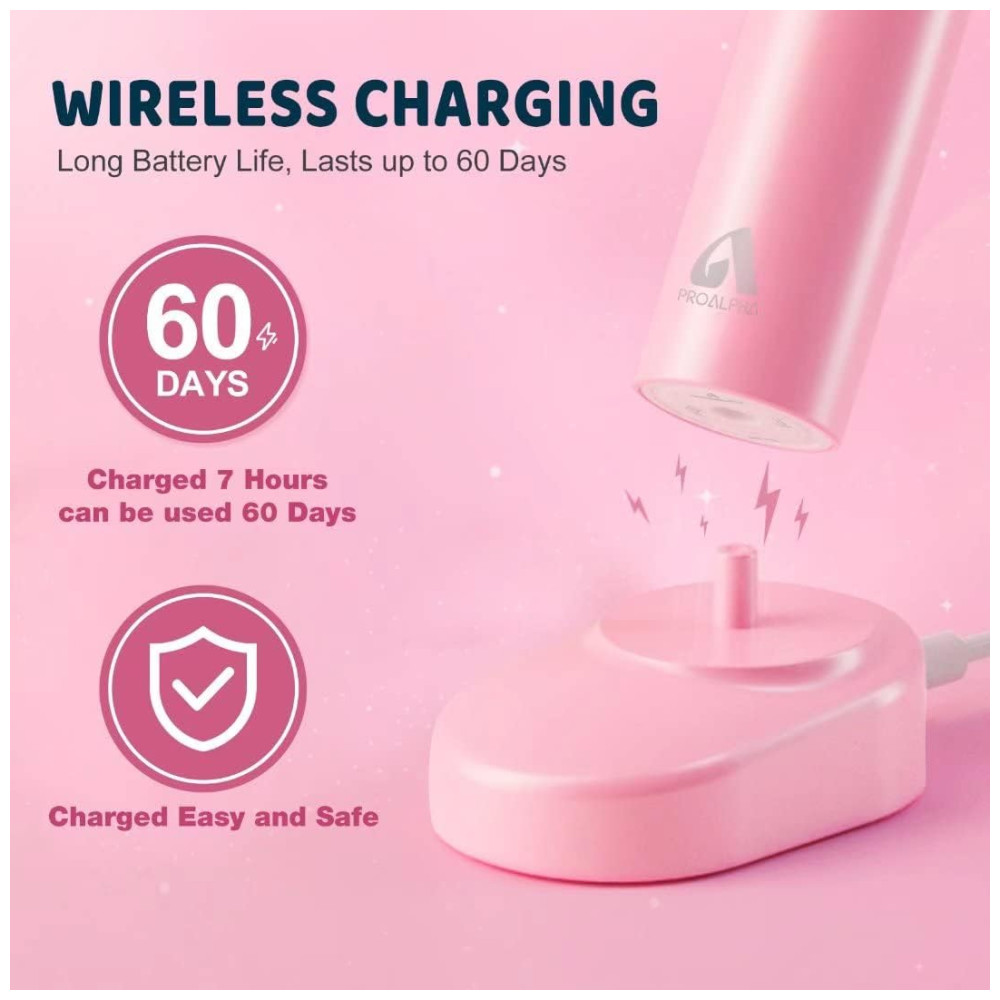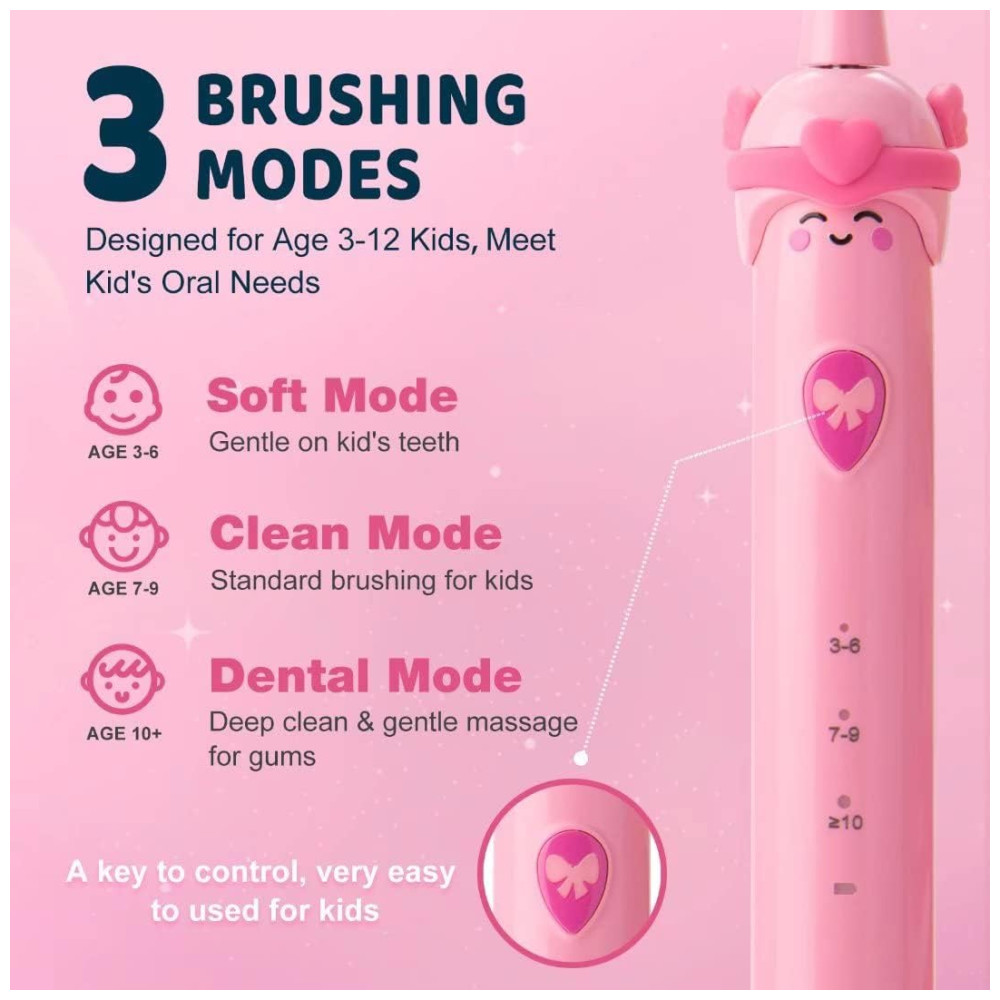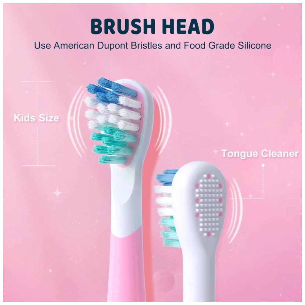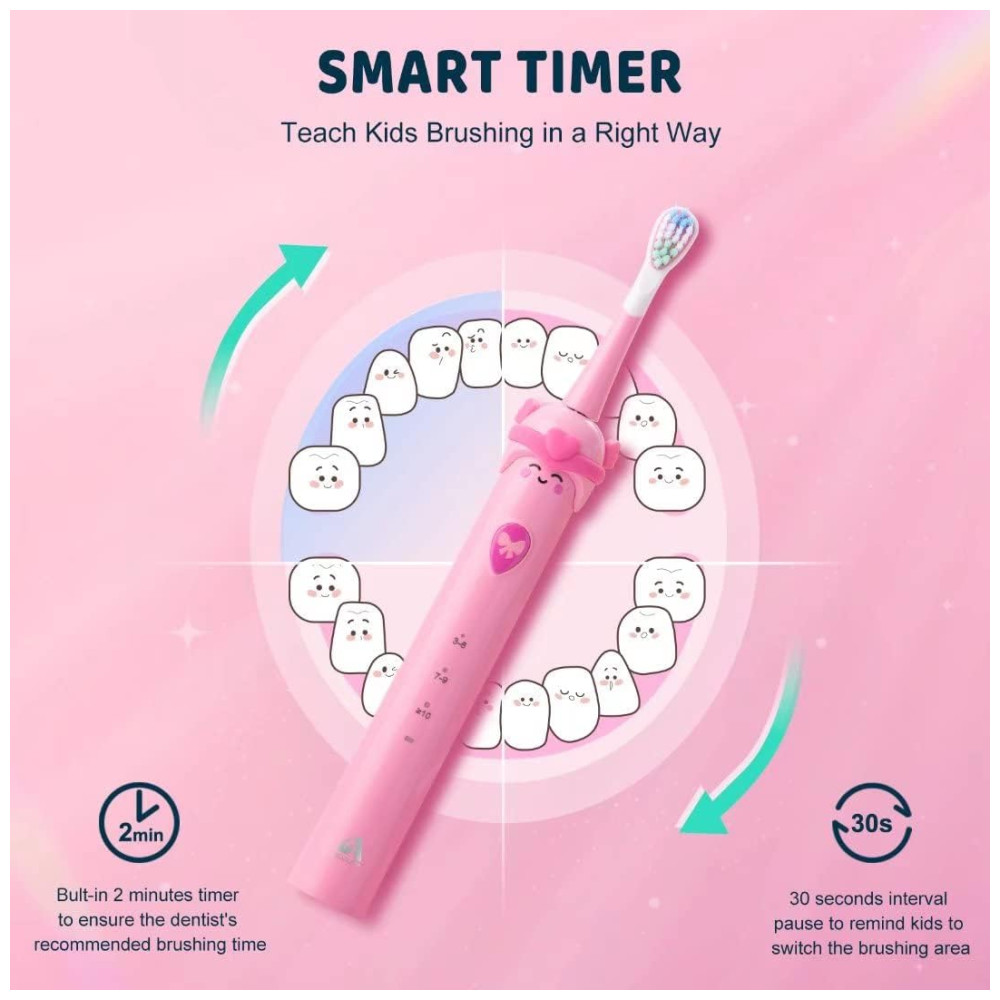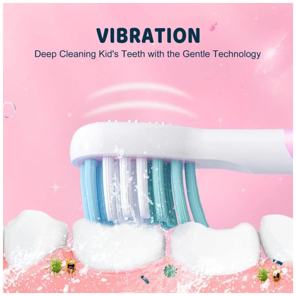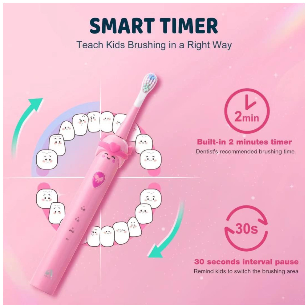 Escova de Dente Elétrica Infantil Sonic Recarrregável proalpha 3 a 12 Anos 3 Modos 2 Cabeças Temporizador IPX7 Rosa