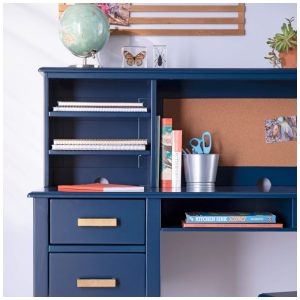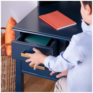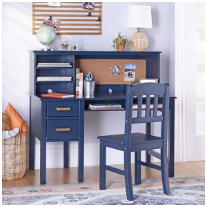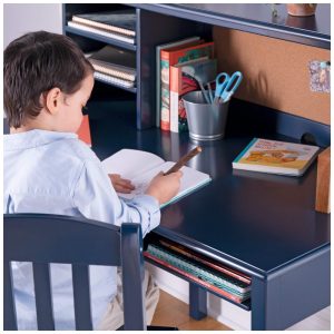 Conjunto infantil completo de escrivaninha, hutch e cadeira em madeira, desenvolvido para oferecer estação de estudo, leitura, computador e atividades criativas para crianças a partir de 5 anos. O design em estilo clássico, com acabamento azul-marinho, integra mesa com gavetas, nichos abertos e quadro de cortiça, criando um ponto fixo de estudo em quartos e salas de brincar.