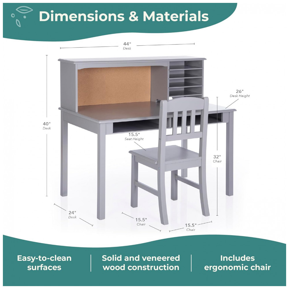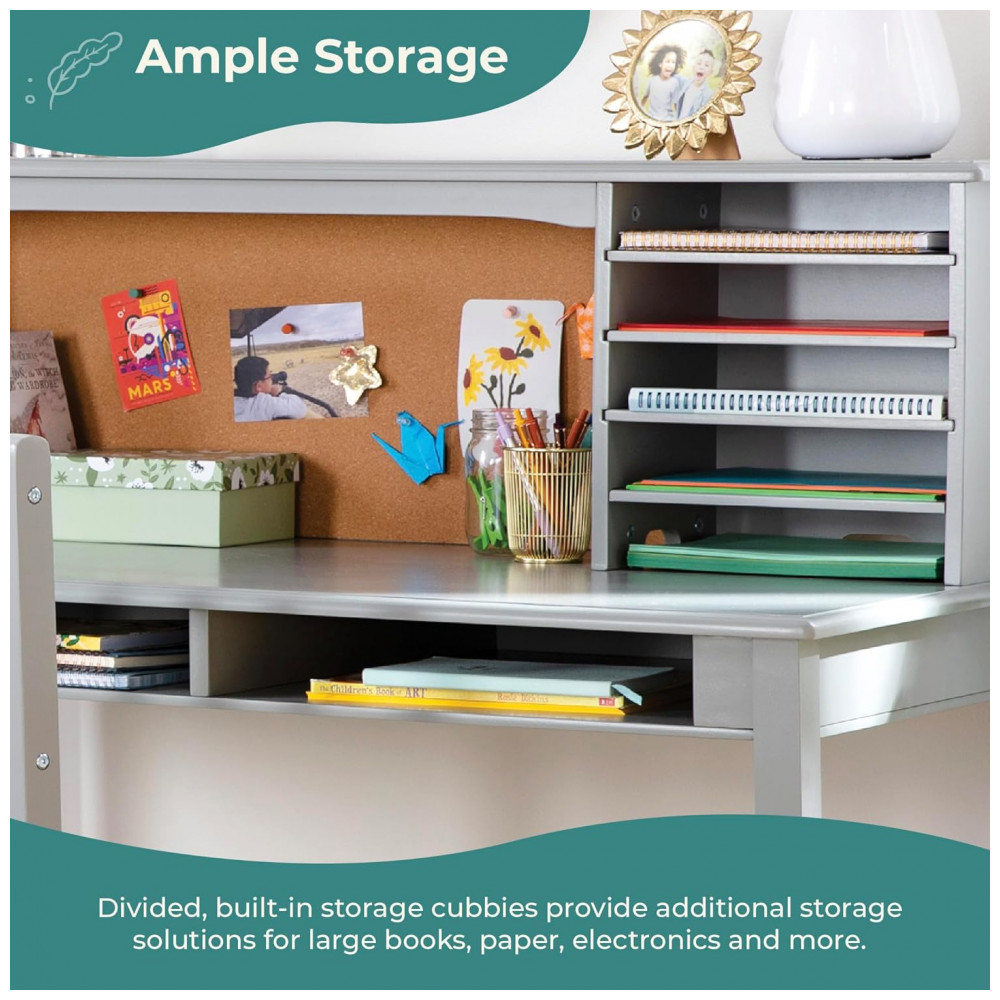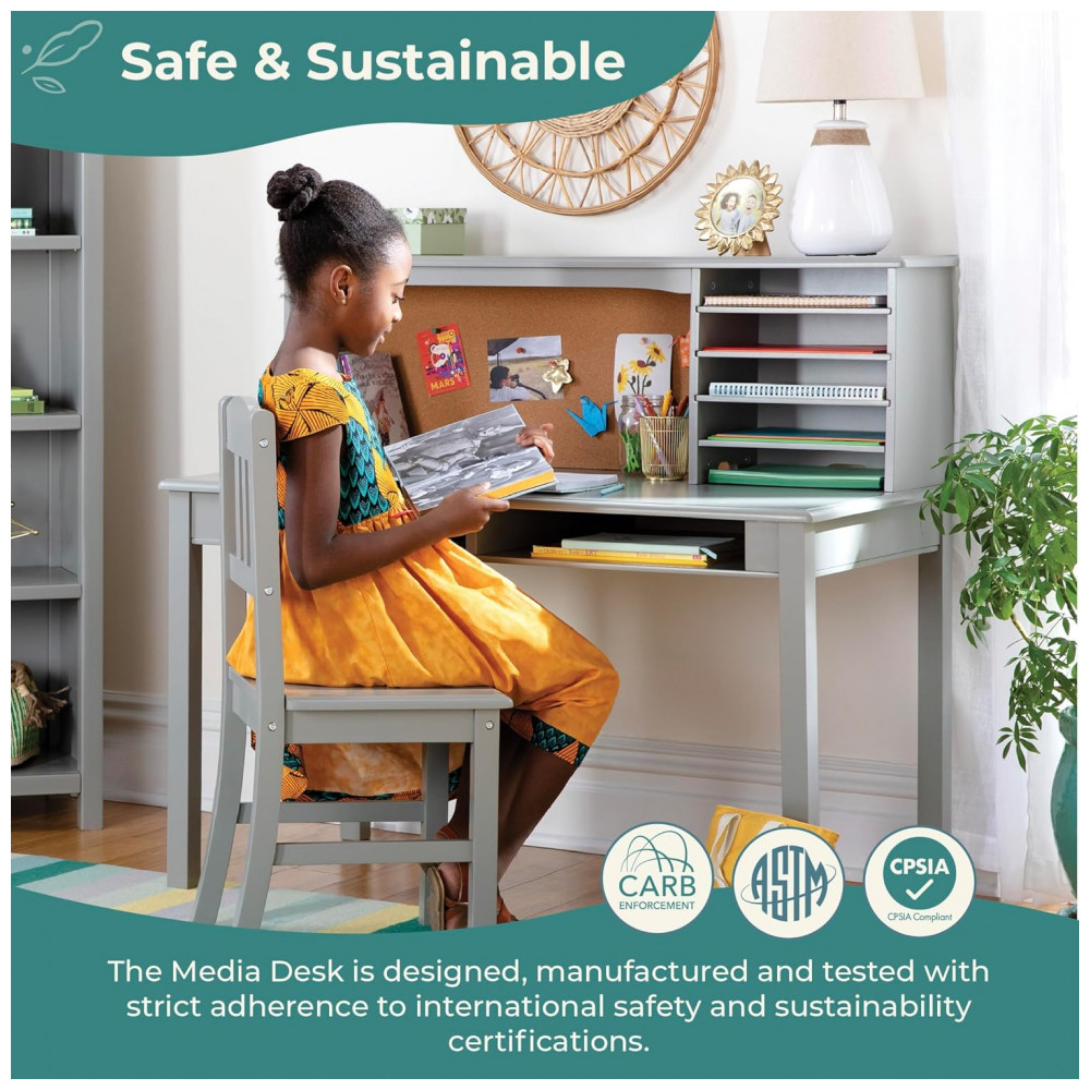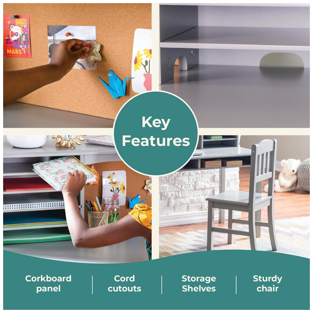 A escrivaninha infantil Guidecraft Kids Media Desk and Chair Set cinza foi desenvolvida como estação completa de estudo para quartos infantis e juvenis, combinando tampo amplo, hutch superior com nichos e quadro de cortiça, e cadeira em madeira coordenada. A estrutura integra passagens para cabos na parte traseira da estante superior, permitindo acomodar notebook, luminária ou outros dispositivos mantendo fios organizados e fora da área principal de trabalho.