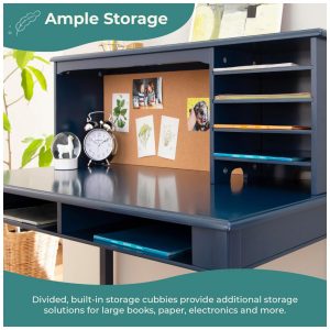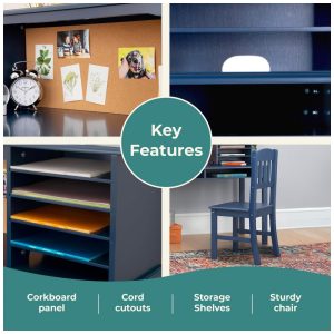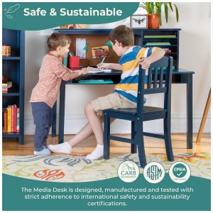 Escrivaninha infantil Guidecraft Kids’ Media Desk azul marinho com hutch nichos e cadeira em madeira para estudo e uso de computador