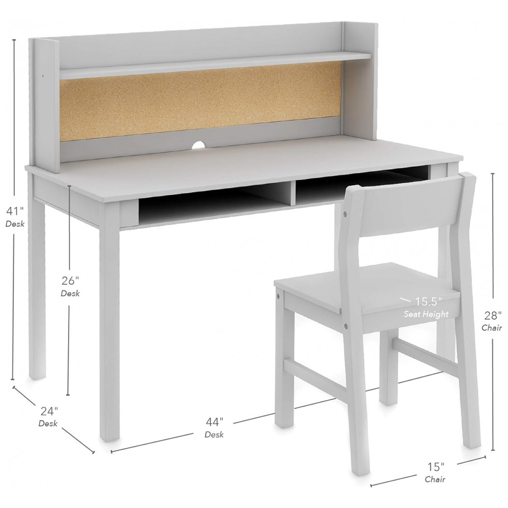 Componentes principais: Mesa com tampo amplo, hutch com prateleira superior e painel de cortiça, cadeira infantil