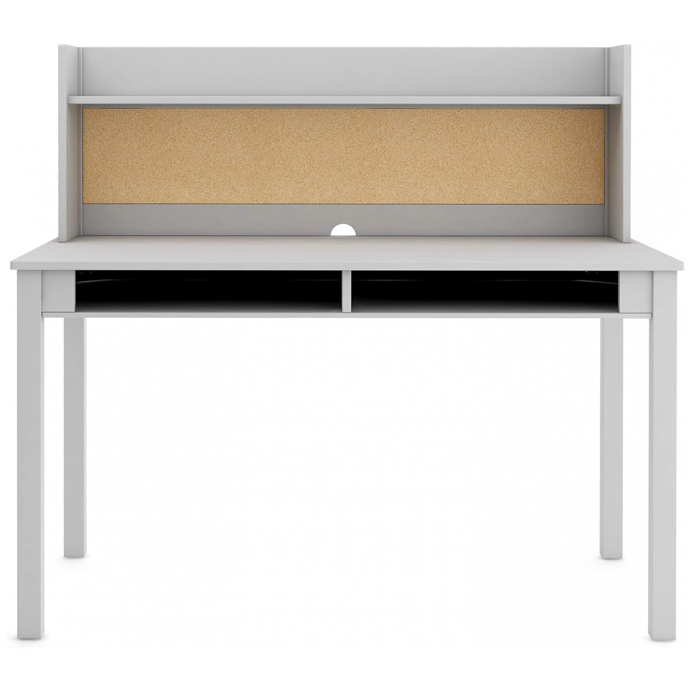 O hutch integra prateleira superior aberta e painel de cortiça para afixar lembretes, fotos e produções, além de recortes para passagem de cabos. O conjunto oferece área de trabalho dimensionada para leitura, escrita, uso de computador e atividades criativas, indicado para crianças a partir de aproximadamente 5 anos.